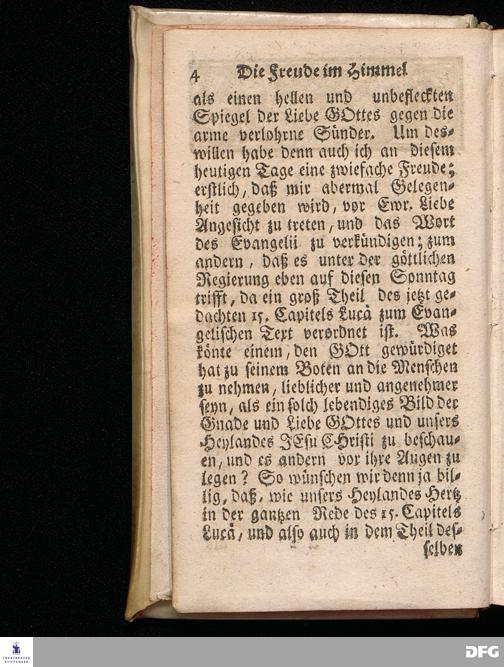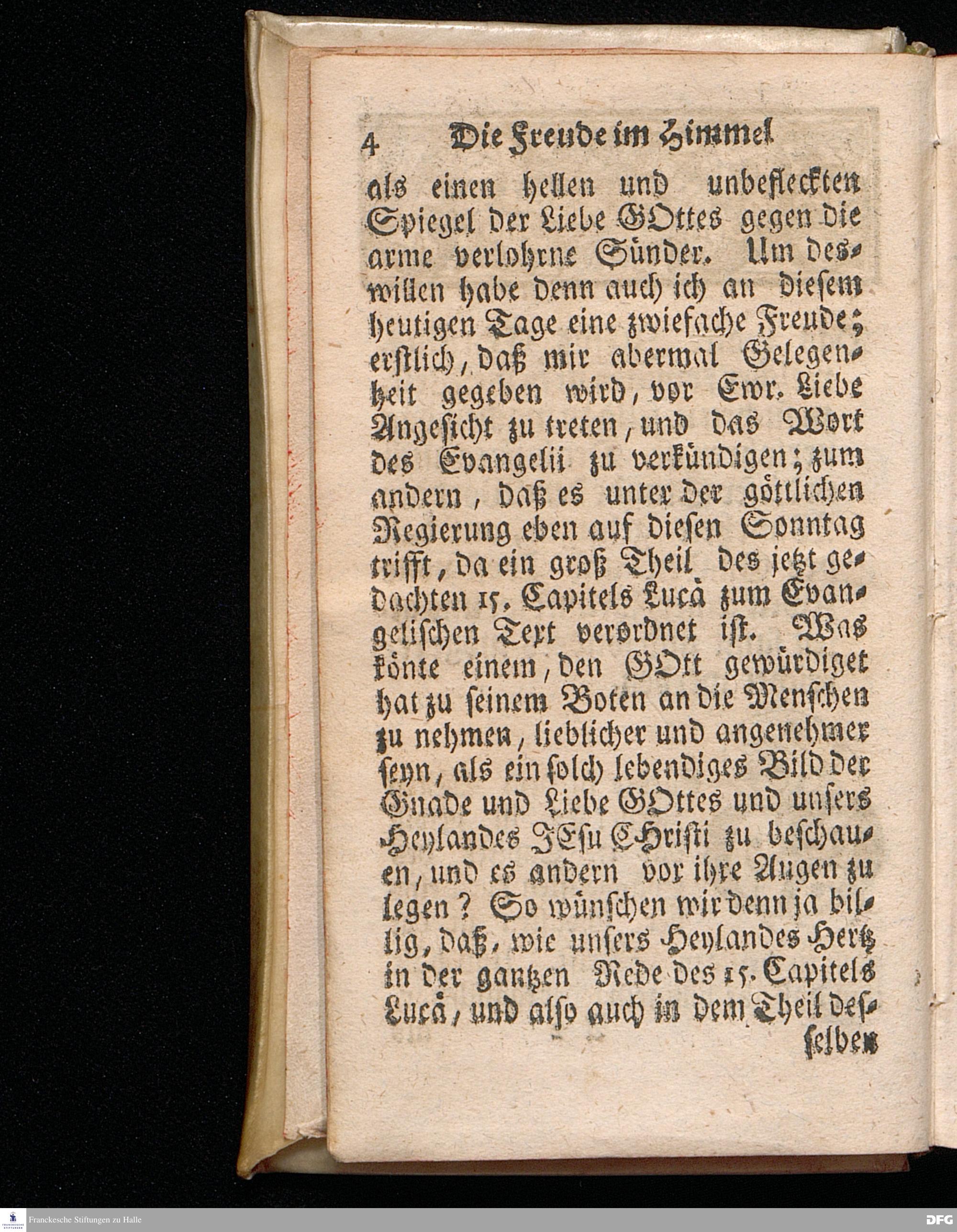 Die Freude im Himmel über eines Sünders Bekehrung, Am 3.Soñt.nach Trinit.1720. In einer über den ordentlichen Evangelisch.Text Luc.XV, 1=16. In der Kirche zu St.Petri in Cölln an der Spree auf geschehenen Antrag gehaltenen Predigt betrachtet und zum Druck überlassen von August Hermann Francken, S.Theol.Prof.Past. Vlric & Gymn. Schol. Andere Auflage. Der Schul=Jugend in den Glauchischen Anstalten nach gehaltenem Examine ausgetheilet den 24ten Aug.1720. HALLE, in Verlegung des Wäysenhause. 1724.