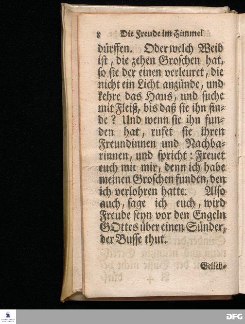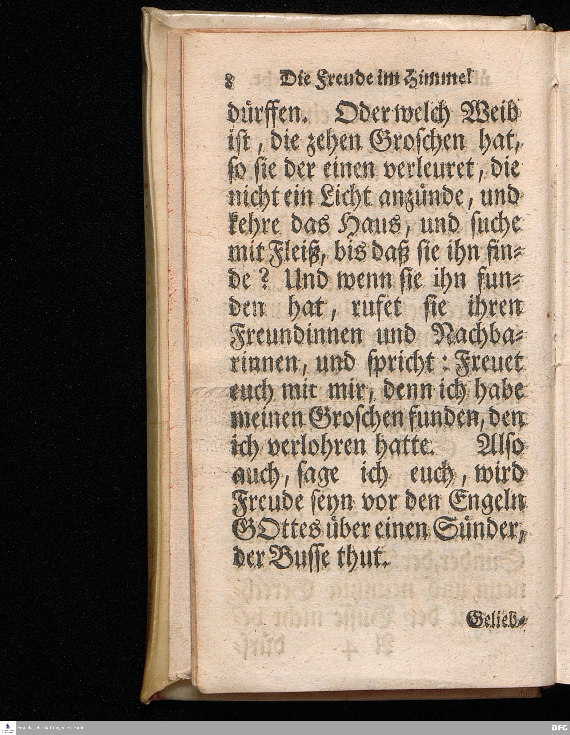 Die Freude im Himmel über eines Sünders Bekehrung, Am 3.Soñt.nach Trinit.1720. In einer über den ordentlichen Evangelisch.Text Luc.XV, 1=16. In der Kirche zu St.Petri in Cölln an der Spree auf geschehenen Antrag gehaltenen Predigt betrachtet und zum Druck überlassen von August Hermann Francken, S.Theol.Prof.Past. Vlric & Gymn. Schol. Andere Auflage. Der Schul=Jugend in den Glauchischen Anstalten nach gehaltenem Examine ausgetheilet den 24ten Aug.1720. HALLE, in Verlegung des Wäysenhause. 1724.