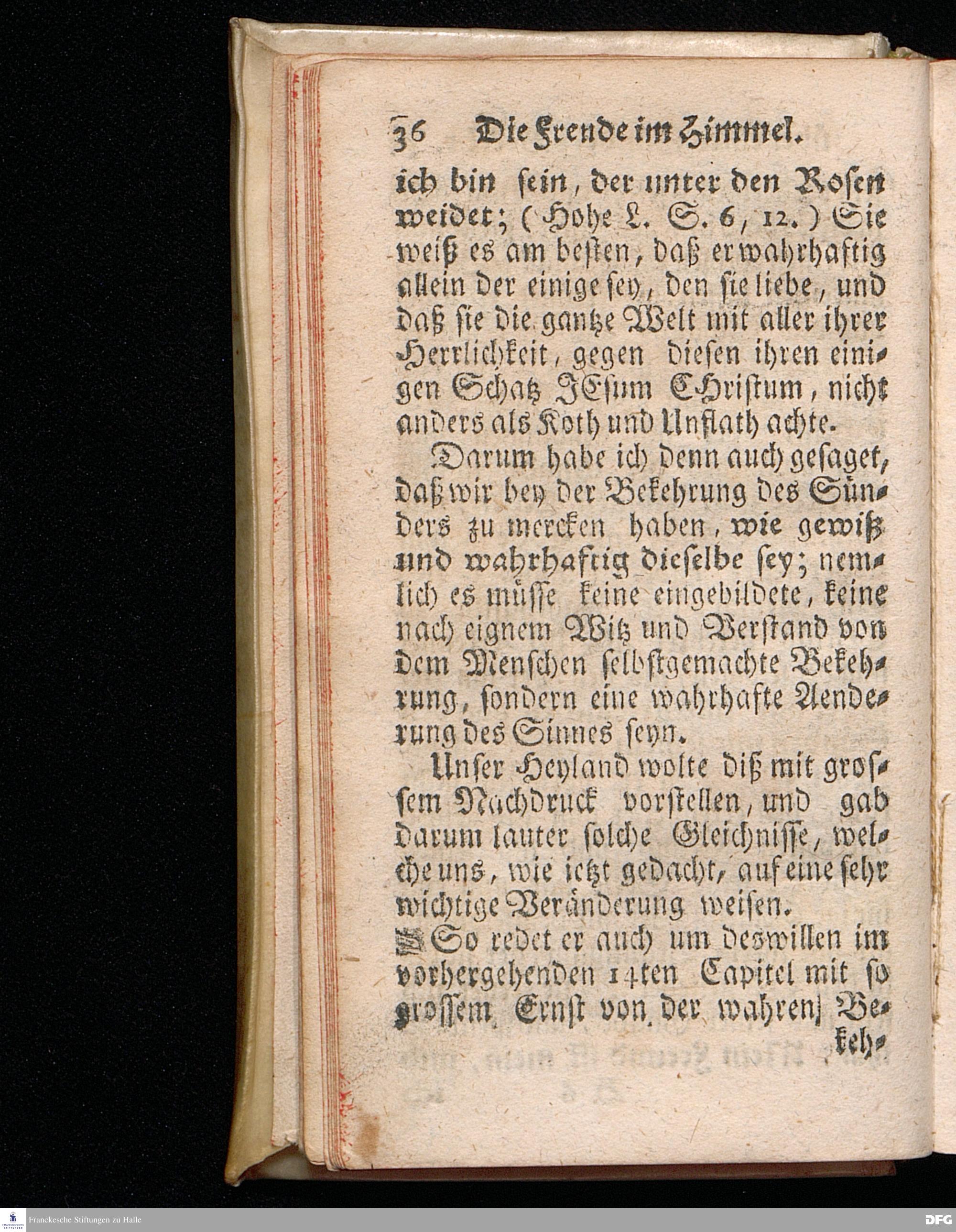 Die Freude im Himmel über eines Sünders Bekehrung, Am 3.Soñt.nach Trinit.1720. In einer über den ordentlichen Evangelisch.Text Luc.XV, 1=16. In der Kirche zu St.Petri in Cölln an der Spree auf geschehenen Antrag gehaltenen Predigt betrachtet und zum Druck überlassen von August Hermann Francken, S.Theol.Prof.Past. Vlric & Gymn. Schol. Andere Auflage. Der Schul=Jugend in den Glauchischen Anstalten nach gehaltenem Examine ausgetheilet den 24ten Aug.1720. HALLE, in Verlegung des Wäysenhause. 1724.