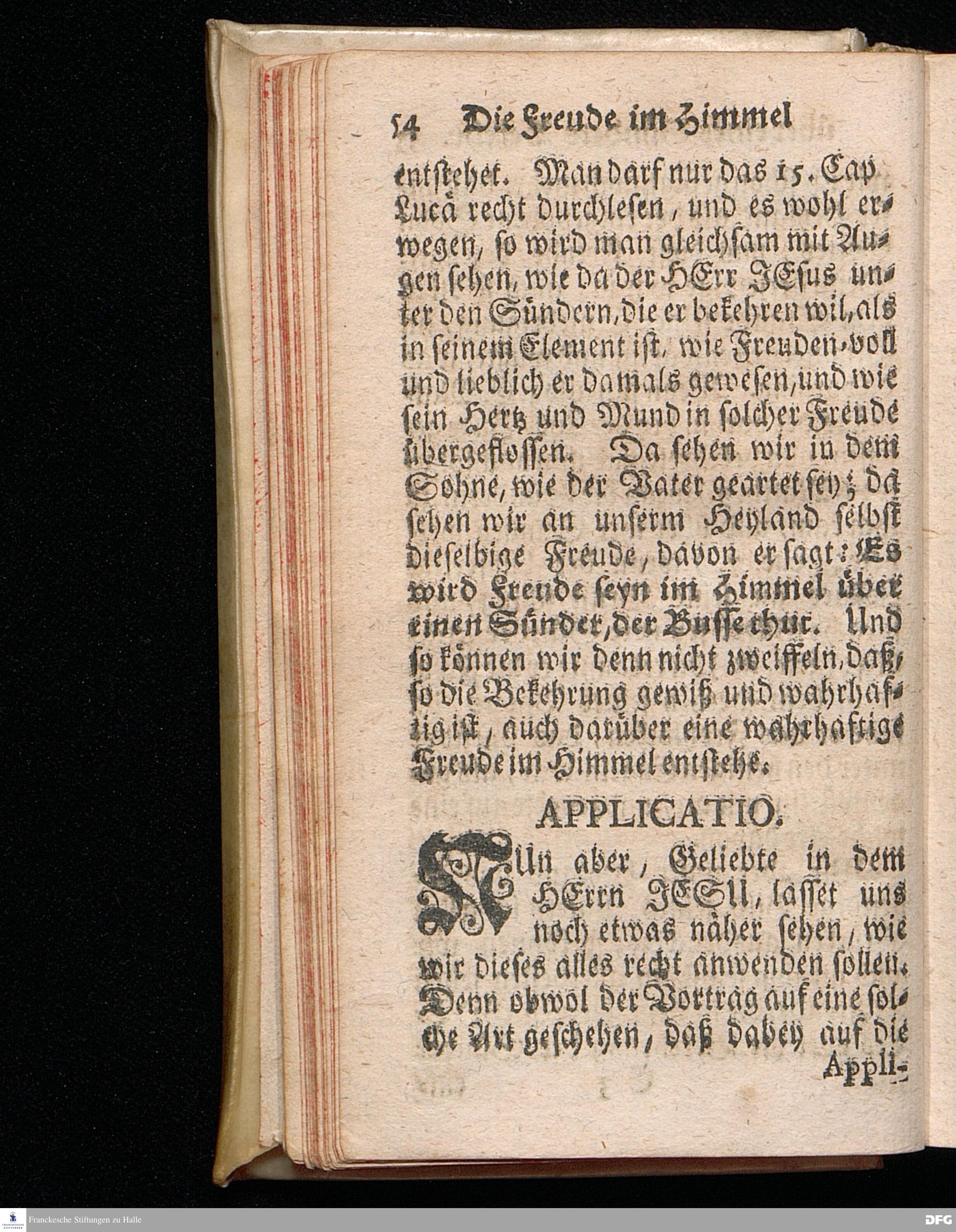 Die Freude im Himmel über eines Sünders Bekehrung, Am 3.Soñt.nach Trinit.1720. In einer über den ordentlichen Evangelisch.Text Luc.XV, 1=16. In der Kirche zu St.Petri in Cölln an der Spree auf geschehenen Antrag gehaltenen Predigt betrachtet und zum Druck überlassen von August Hermann Francken, S.Theol.Prof.Past. Vlric & Gymn. Schol. Andere Auflage. Der Schul=Jugend in den Glauchischen Anstalten nach gehaltenem Examine ausgetheilet den 24ten Aug.1720. HALLE, in Verlegung des Wäysenhause. 1724.