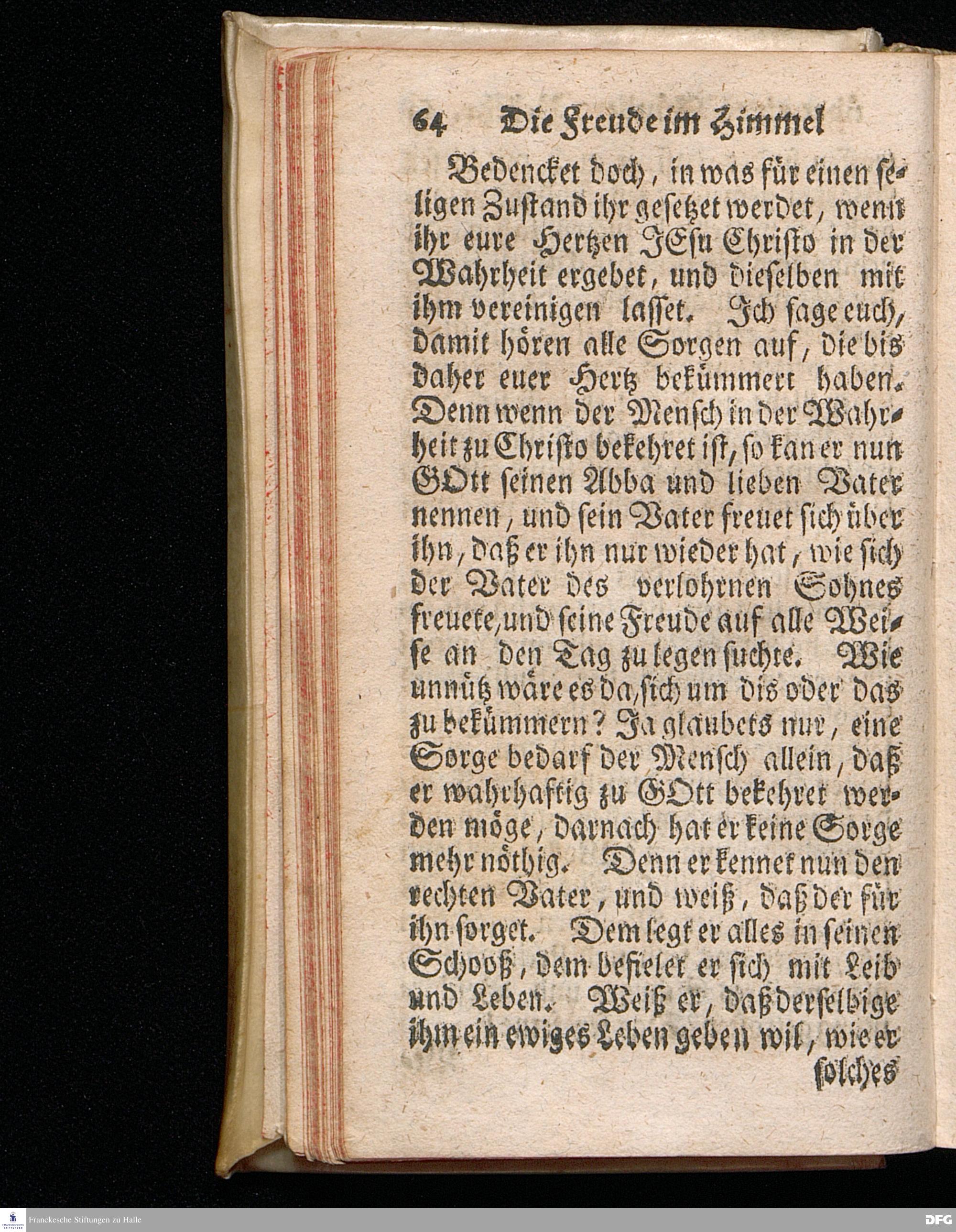 Die Freude im Himmel über eines Sünders Bekehrung, Am 3.Soñt.nach Trinit.1720. In einer über den ordentlichen Evangelisch.Text Luc.XV, 1=16. In der Kirche zu St.Petri in Cölln an der Spree auf geschehenen Antrag gehaltenen Predigt betrachtet und zum Druck überlassen von August Hermann Francken, S.Theol.Prof.Past. Vlric & Gymn. Schol. Andere Auflage. Der Schul=Jugend in den Glauchischen Anstalten nach gehaltenem Examine ausgetheilet den 24ten Aug.1720. HALLE, in Verlegung des Wäysenhause. 1724.