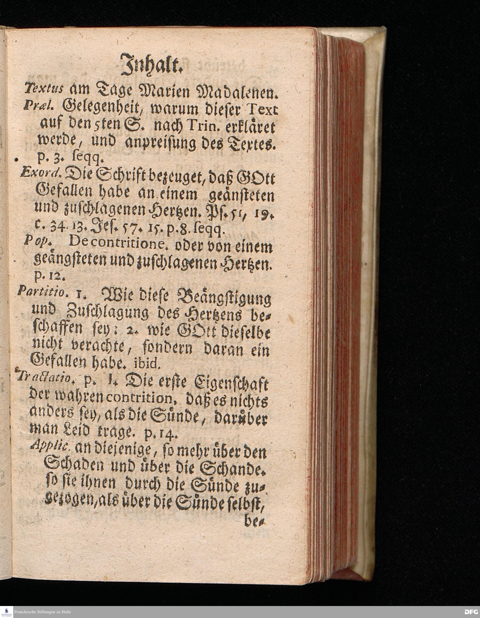 Das der Sünden wegen Geängstete und Zuschlagene Hertz Aus dem Evangelischen Text Luc.VII, 36--50. Welcher sonst auf den Tag Mar.Magdal.verordnet ist, Am V.Sonntag nach Trinitatis. ANNO 1715. In der Ulrichs=Kirchen zu Halle vorgestellet von August Hermann Francken / S.Th.Pr.O.Past.Ulric.und des Gymnasii daselbst Scholarcha. Der Jugend in den Schulen des Wäysenhauses Nach gehaltenem EXAMINE dem 17.Augusti gedachten Jahrs ausgetheilet. andere Auflage. HALLE in Verlegung des Wäysenhauses, 1723.