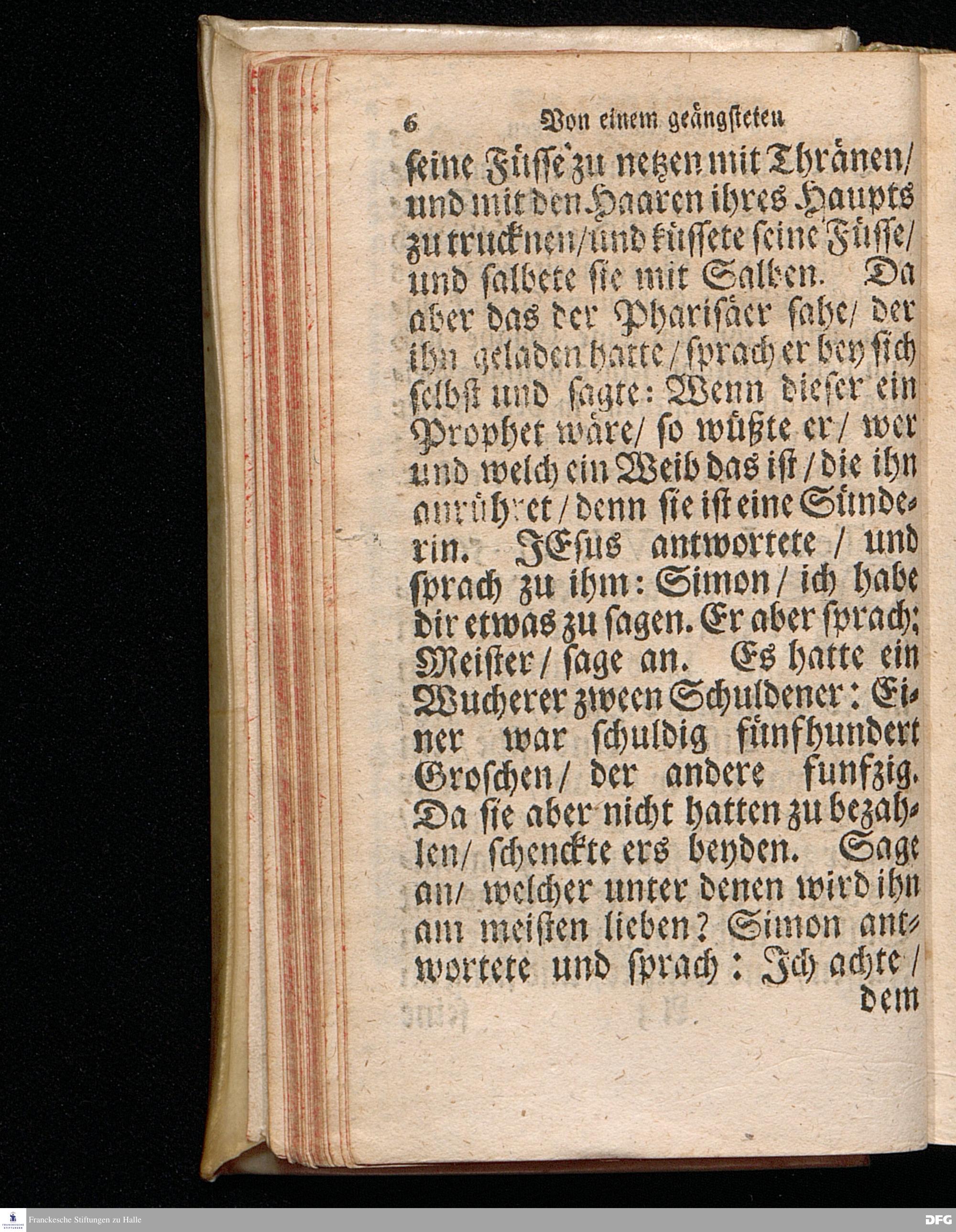 Das der Sünden wegen Geängstete und Zuschlagene Hertz Aus dem Evangelischen Text Luc.VII, 36--50. Welcher sonst auf den Tag Mar.Magdal.verordnet ist, Am V.Sonntag nach Trinitatis. ANNO 1715. In der Ulrichs=Kirchen zu Halle vorgestellet von August Hermann Francken / S.Th.Pr.O.Past.Ulric.und des Gymnasii daselbst Scholarcha. Der Jugend in den Schulen des Wäysenhauses Nach gehaltenem EXAMINE dem 17.Augusti gedachten Jahrs ausgetheilet. andere Auflage. HALLE in Verlegung des Wäysenhauses, 1723.