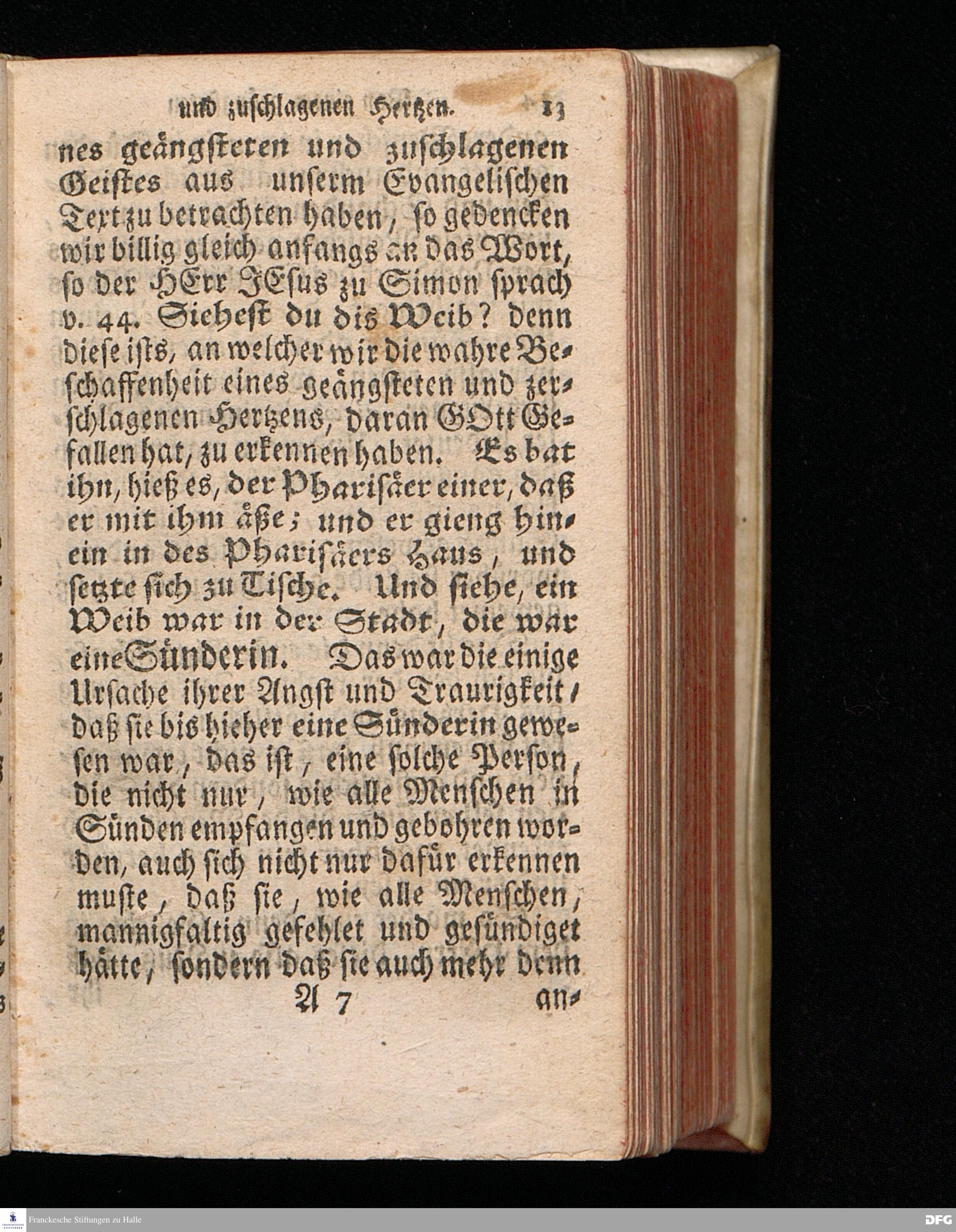Das der Sünden wegen Geängstete und Zuschlagene Hertz Aus dem Evangelischen Text Luc.VII, 36--50. Welcher sonst auf den Tag Mar.Magdal.verordnet ist, Am V.Sonntag nach Trinitatis. ANNO 1715. In der Ulrichs=Kirchen zu Halle vorgestellet von August Hermann Francken / S.Th.Pr.O.Past.Ulric.und des Gymnasii daselbst Scholarcha. Der Jugend in den Schulen des Wäysenhauses Nach gehaltenem EXAMINE dem 17.Augusti gedachten Jahrs ausgetheilet. andere Auflage. HALLE in Verlegung des Wäysenhauses, 1723.