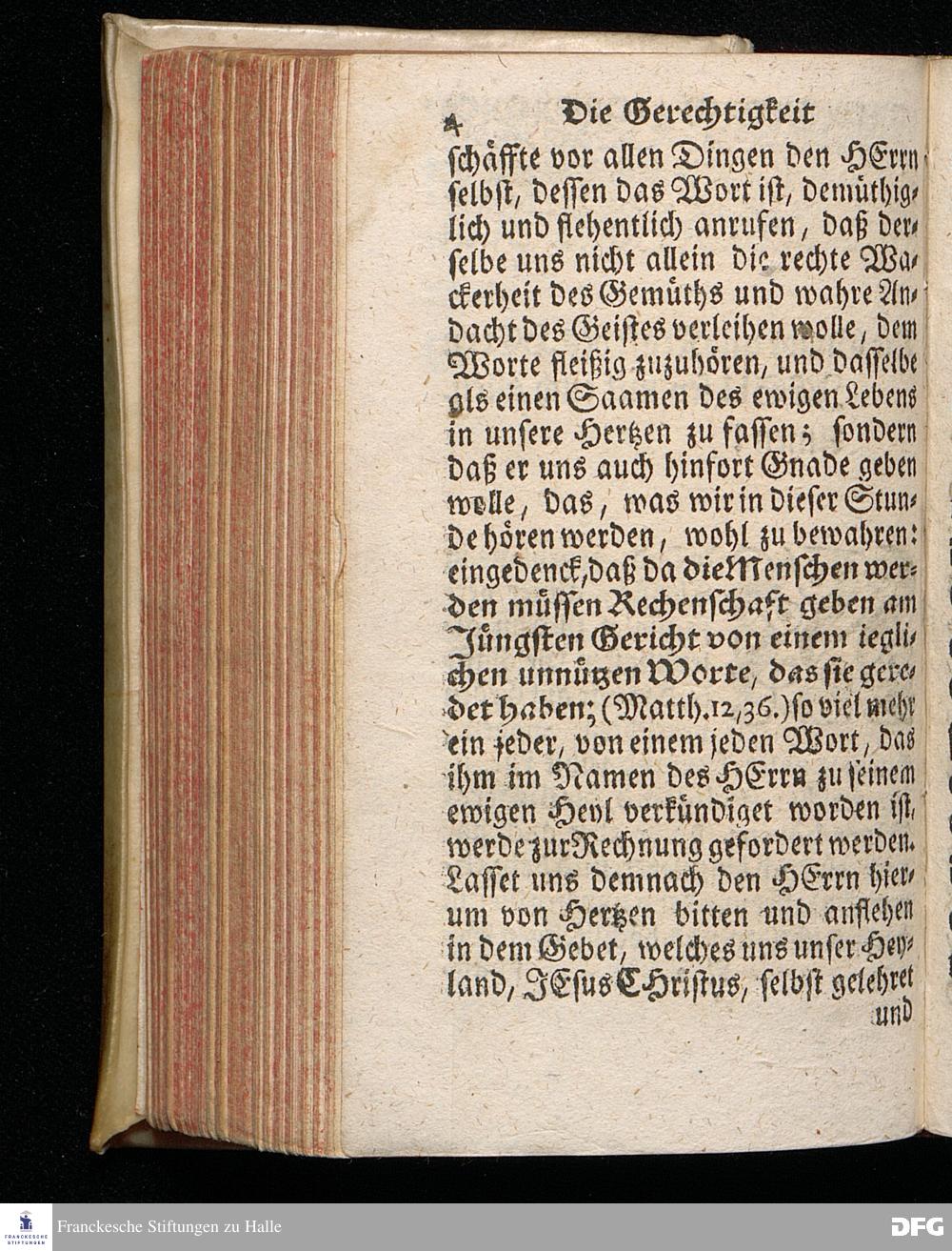 Die Gerechtigkeit und Stärcke im HErrn, am XIX.Sonntage nach Trinitatis 1720.aus dem ordentlichen Evangelio Matth. IX, 1-8. In einer vor S.Königl.Majest.in Preussen auf Deroselben allergnädigstem Befehl In der Schul=Kirche zu Halle gehaltenen und zum Druck beforderten Predigt vorgestellet von August Hermann Francken / S.Theolog.Prof.Past.Ulric.& Gymnasii Scholarcha. Andere Auflage. HALLE, Gedruckt im Wäysen=Hause. MDCCXXIII.