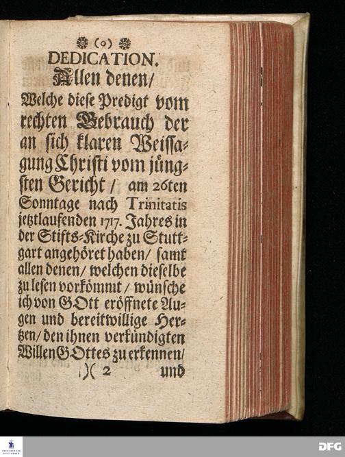Anleitung zum rechten Gebrauch der an sich klaren Weissagung CHRISTI vom jüngsten Gerichte / am 26.Sonntage nach Trinit.1717.aus Matth.25, 31-46. in einer Mit gnädigster Bewilligung der Regierenden Hoch=Fürstl. Herrschaft ihme aufgetragenen, und in der Stifts=Kirchen zu Stuttgart abgelegten Predigt ertheilet, und auf Erfordern zum Druck gegeben von August Hermann Francken / S.Theol.Prof.Pastore u.Scholarcha zu Halle im Hertzogthum Magdeburg. Andere Auflage / Nach dem zu Stuttgart gedruckten Exemplar in Halle abgedruckt. 1717.