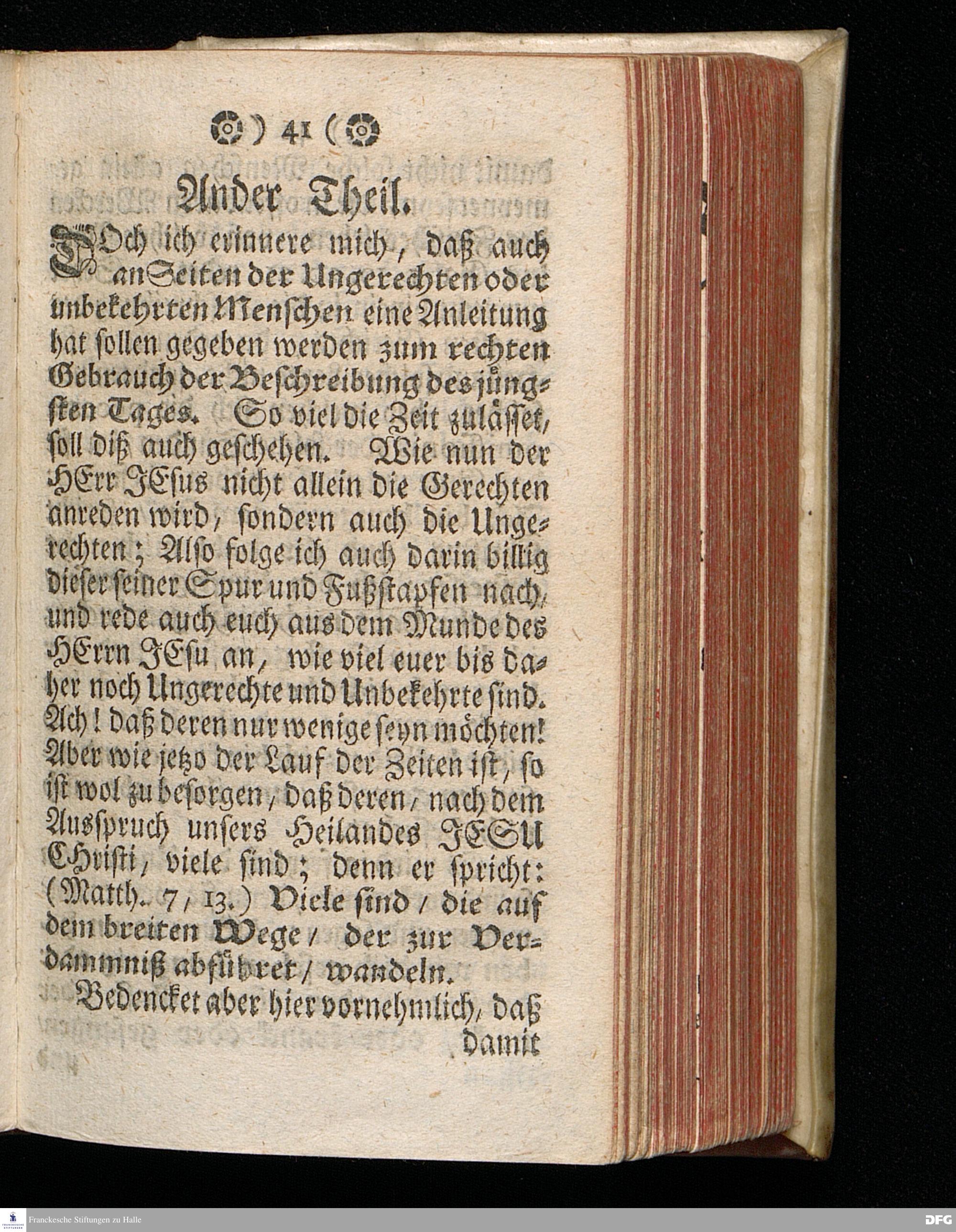 Anleitung zum rechten Gebrauch der an sich klaren Weissagung CHRISTI vom jüngsten Gerichte / am 26.Sonntage nach Trinit.1717.aus Matth.25, 31-46. in einer Mit gnädigster Bewilligung der Regierenden Hoch=Fürstl. Herrschaft ihme aufgetragenen, und in der Stifts=Kirchen zu Stuttgart abgelegten Predigt ertheilet, und auf Erfordern zum Druck gegeben von August Hermann Francken / S.Theol.Prof.Pastore u.Scholarcha zu Halle im Hertzogthum Magdeburg. Andere Auflage / Nach dem zu Stuttgart gedruckten Exemplar in Halle abgedruckt. 1717.