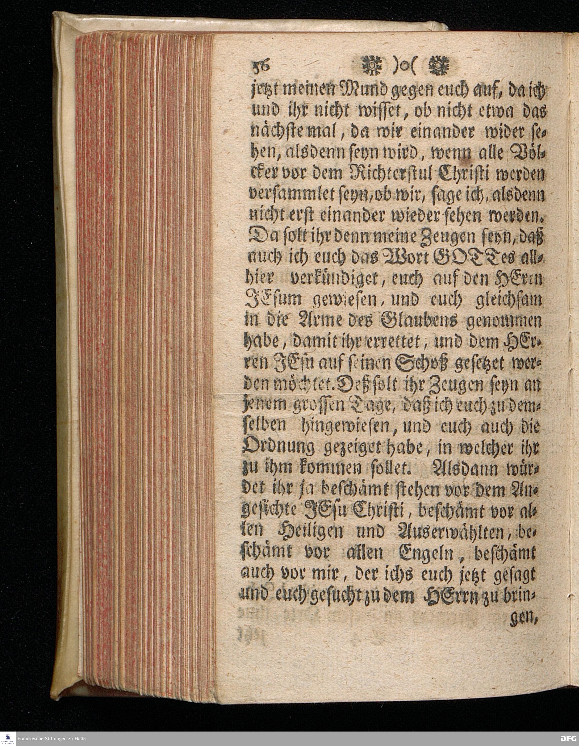 Anleitung zum rechten Gebrauch der an sich klaren Weissagung CHRISTI vom jüngsten Gerichte / am 26.Sonntage nach Trinit.1717.aus Matth.25, 31-46. in einer Mit gnädigster Bewilligung der Regierenden Hoch=Fürstl. Herrschaft ihme aufgetragenen, und in der Stifts=Kirchen zu Stuttgart abgelegten Predigt ertheilet, und auf Erfordern zum Druck gegeben von August Hermann Francken / S.Theol.Prof.Pastore u.Scholarcha zu Halle im Hertzogthum Magdeburg. Andere Auflage / Nach dem zu Stuttgart gedruckten Exemplar in Halle abgedruckt. 1717.
