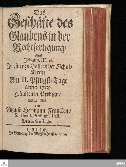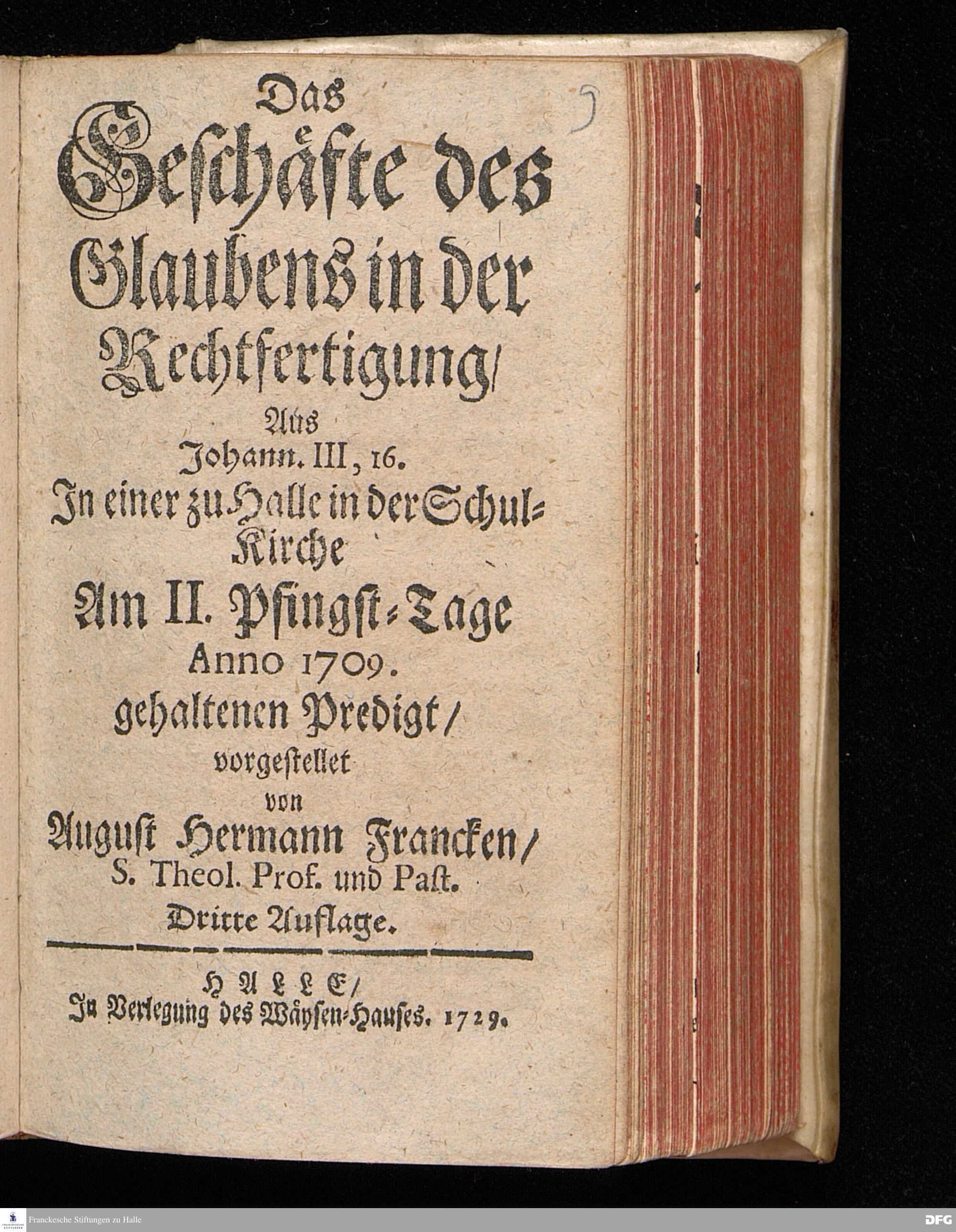 Das Geschäfte des Glaubens in der Rechtfertigung / Aus Johann.III, 16. In einer zu Halle in der Schul=Kirche Am II.Pfingst=Tage Anno 1709. gehaltenen Predigt / vorgestellet von August Hermann Francken / S.Theol.Prof.und Past. Dritte Auflage. HALLE / In Verlegung des Wäysen=Hauses. 1729.