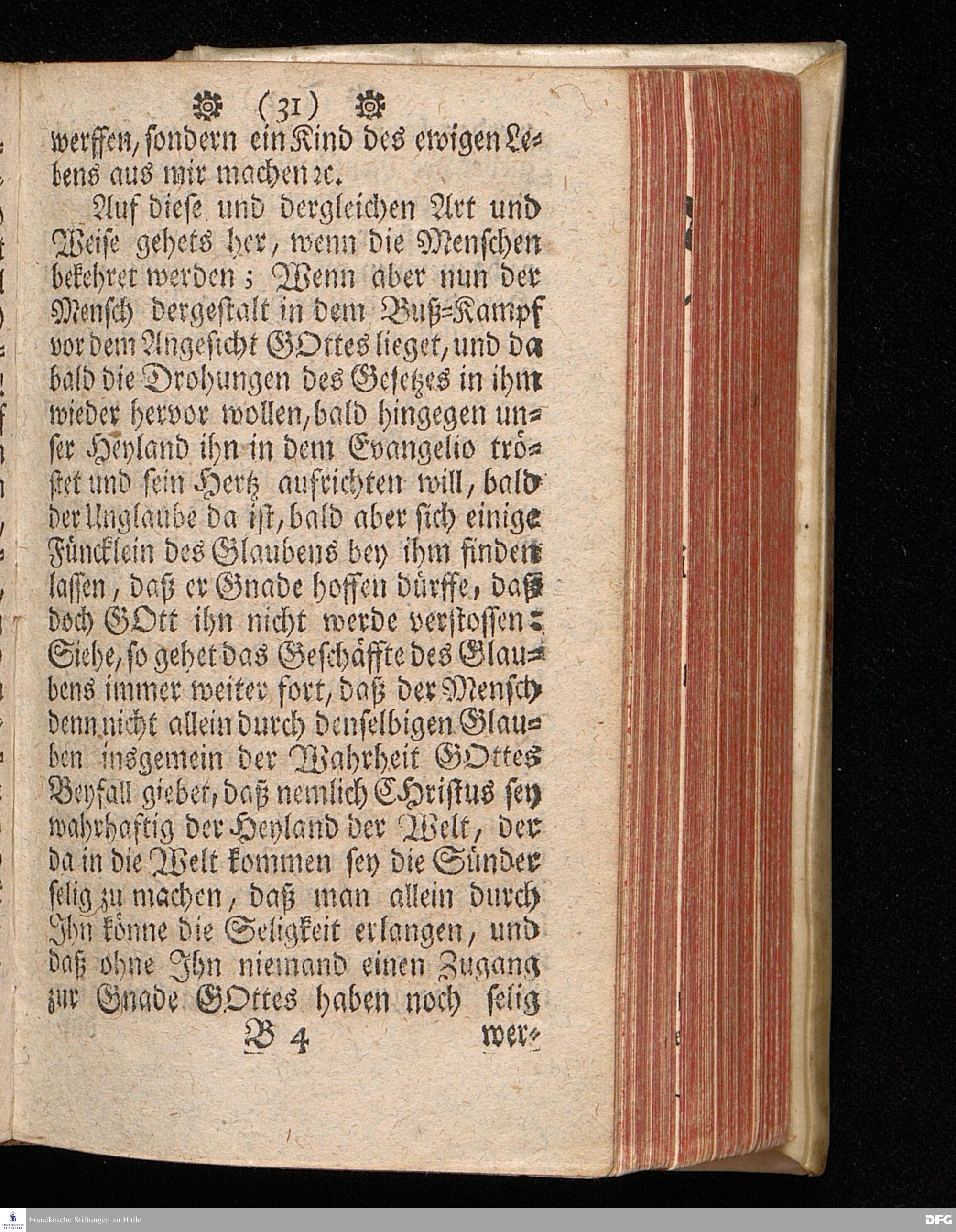 Das Geschäfte des Glaubens in der Rechtfertigung / Aus Johann.III, 16. In einer zu Halle in der Schul=Kirche Am II.Pfingst=Tage Anno 1709. gehaltenen Predigt / vorgestellet von August Hermann Francken / S.Theol.Prof.und Past. Dritte Auflage. HALLE / In Verlegung des Wäysen=Hauses. 1729.