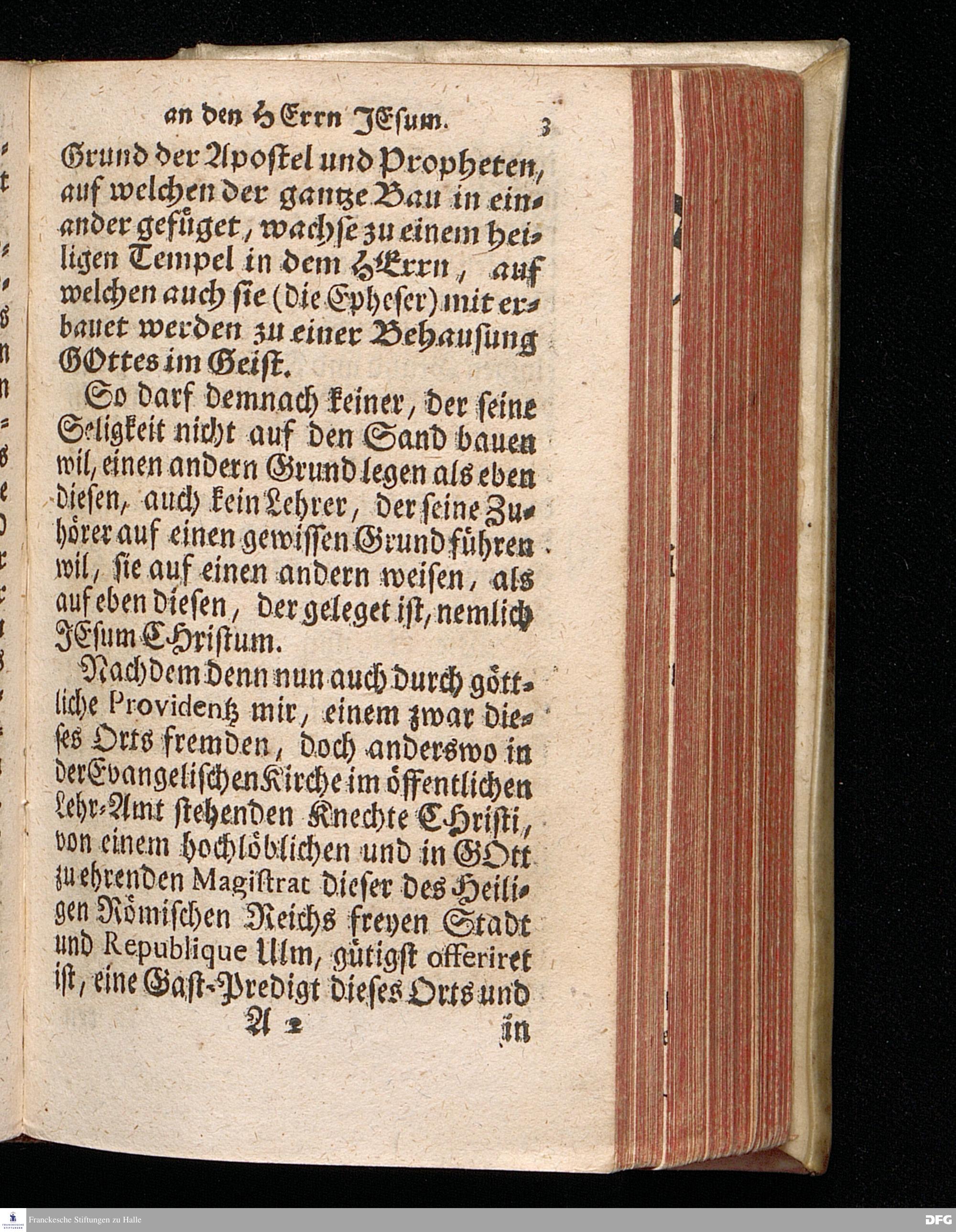 Der Glaube an den HErrn JESUM, Am II.Sonntage nach Epiphan. Anno 1718. in einer über den ordentlichen Evangelischen Text Joh.II, 1--11. Im Münster der des H.R.R.freyen Stadt Ulm / auf hochgeneigten Antrag E.Hochlöblichen Magistrats / gehaltenen Predigt vorgestellet, und auf Begehren zum Druck gegeben, von August Hermann Francken / S.Theol.Prof.Past.& Ulr.und Scholarcha zu Halle. Andere Auflage. HALLE, In Verlegung des Wäysenhauses / 1723.