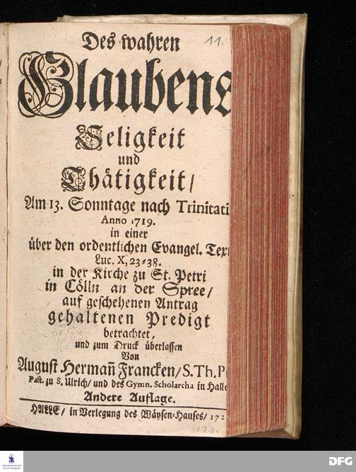 Des wahren Glaubens Seligkeit und Thätigkeit / Am 13.Sonntage nach Trinitatis. Anno 1719. in einer über den ordentlichen Evangel.Text Luc.X, 23-38.[vielmehr 23-28] in der Kirche zu St.Petri in Cölln an der Spree / auf geschehenen Antrag gehaltenen Predigt betrachtet, und zum Druck überlassen Von August Hermañ Francken / S.Th.Prof.Past.zu S.Ulrich / und des Gymn.Scholarcha in Halle. Andere Auflage. HALLE / in Verlegung des Wäysen=Hauses / 1723.