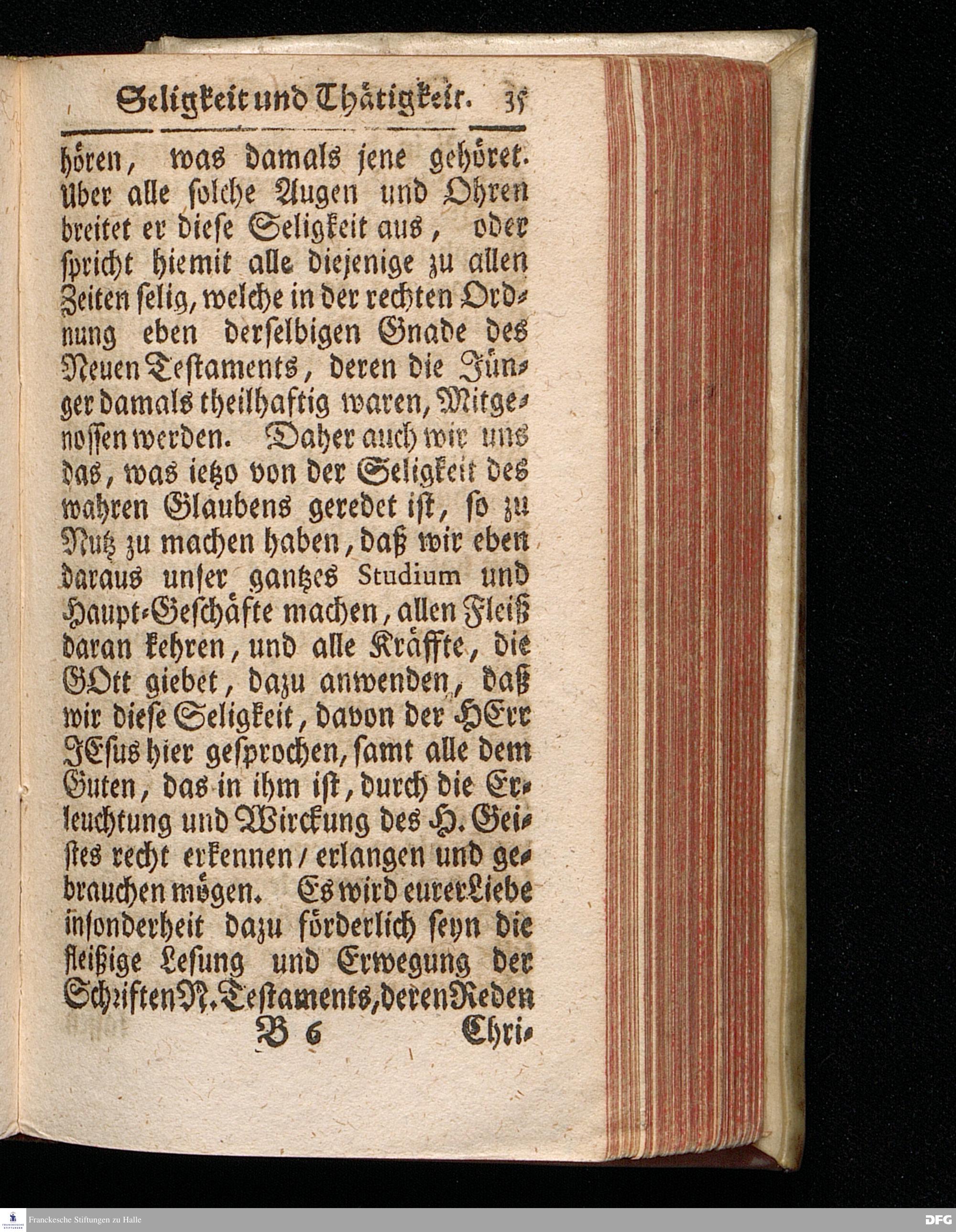 Des wahren Glaubens Seligkeit und Thätigkeit / Am 13.Sonntage nach Trinitatis. Anno 1719. in einer über den ordentlichen Evangel.Text Luc.X, 23-38.[vielmehr 23-28] in der Kirche zu St.Petri in Cölln an der Spree / auf geschehenen Antrag gehaltenen Predigt betrachtet, und zum Druck überlassen Von August Hermañ Francken / S.Th.Prof.Past.zu S.Ulrich / und des Gymn.Scholarcha in Halle. Andere Auflage. HALLE / in Verlegung des Wäysen=Hauses / 1723.