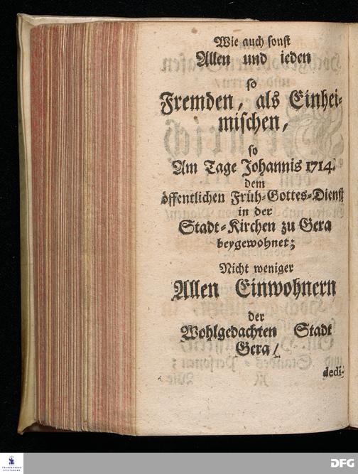 Die Gnade GOttes In CHristo JESU, Aus dem Evangelischen Text Luc.I, 57-80. Am Tage Johannis des Täuffers Ao.1714. In einer auf Erfordern In der Stadt=Kirchen zu Gera im Vogt-Lande gehaltenen Predigt vorgestellet von August Hermann Francken / S.Theol.Prof.Ord.& Past. Andere Auflage. Halle / gedruckt im Wäysen=Hause 1723.