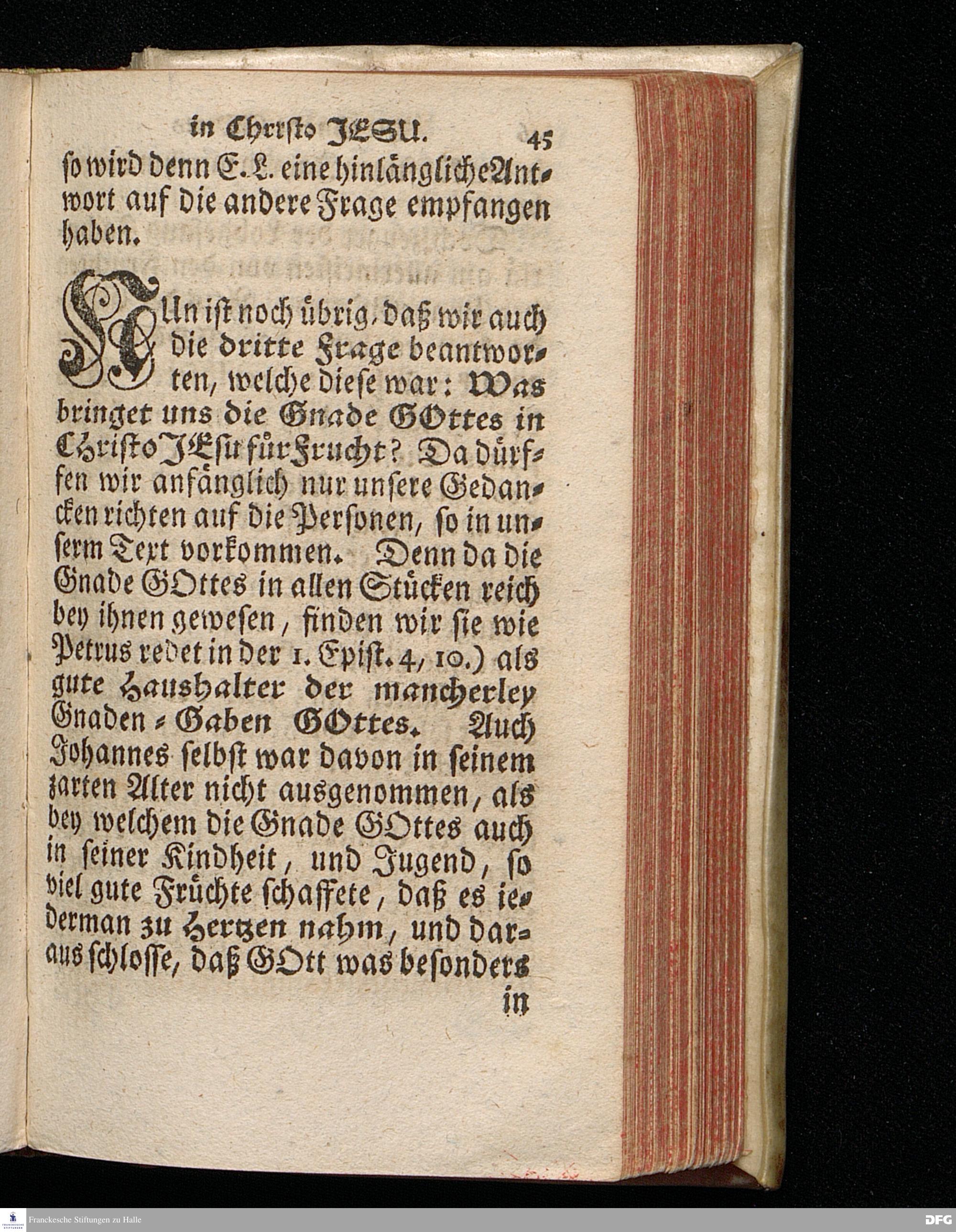 Die Gnade GOttes In CHristo JESU, Aus dem Evangelischen Text Luc.I, 57-80. Am Tage Johannis des Täuffers Ao.1714. In einer auf Erfordern In der Stadt=Kirchen zu Gera im Vogt-Lande gehaltenen Predigt vorgestellet von August Hermann Francken / S.Theol.Prof.Ord.& Past. Andere Auflage. Halle / gedruckt im Wäysen=Hause 1723.