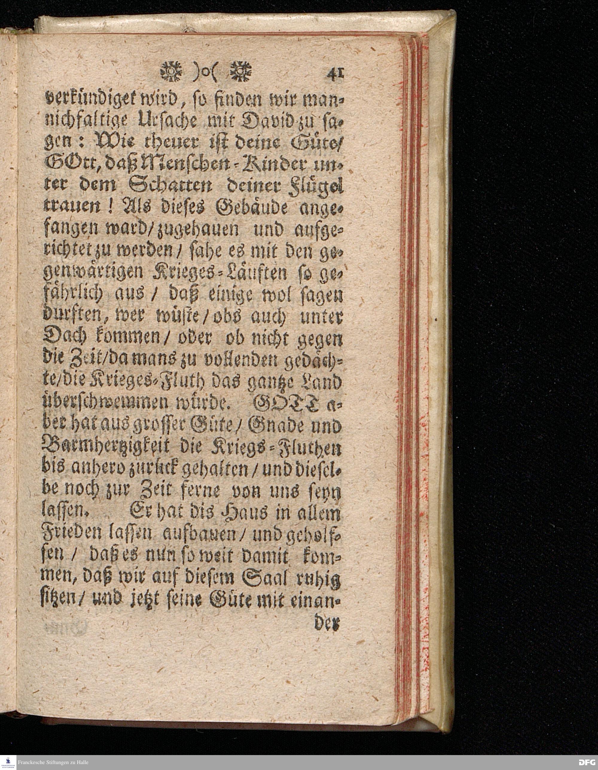 Die Güte GOttes und die Sicherheit unter dem Schatten seiner Flügel / Bey dem ersten öffentlichen Gebrauch eines neu=erbaueten Saals im Waysen=Hause zu Glaucha an Halle / den 5.August. MDCCXI. aus schuldiger Danckbarkeit gegen GOtt und zur Erweckung und Stärckung des Vertrauens auf denselben lebendigen GOTT / vorgestellet Von August Hermann Francken / S.Theol.Prof.Ord.Past.Vlr.u.Sch. Andere Auflage. HALLE, In Verlegung des Wäysenhauses / 1716.