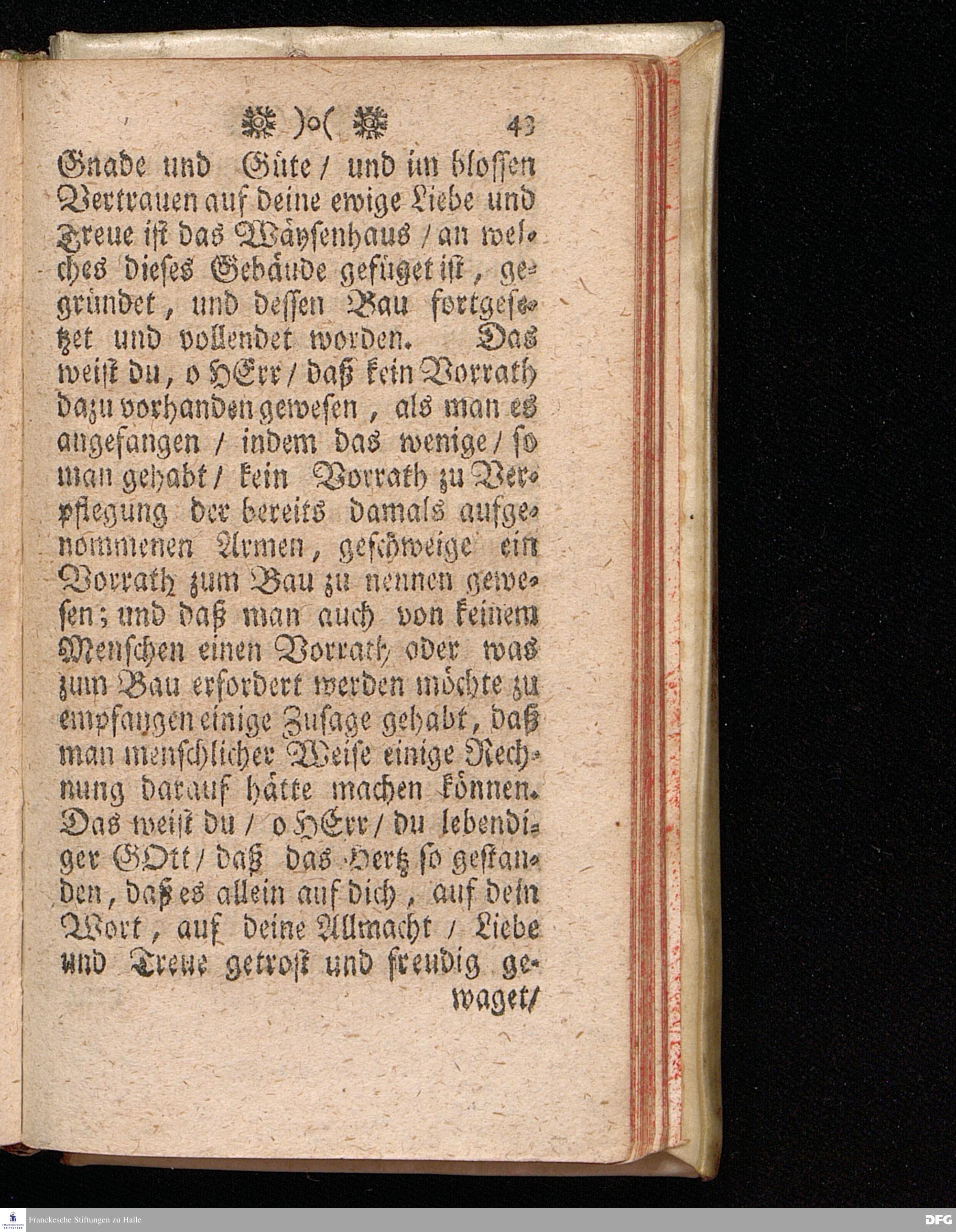 Die Güte GOttes und die Sicherheit unter dem Schatten seiner Flügel / Bey dem ersten öffentlichen Gebrauch eines neu=erbaueten Saals im Waysen=Hause zu Glaucha an Halle / den 5.August. MDCCXI. aus schuldiger Danckbarkeit gegen GOtt und zur Erweckung und Stärckung des Vertrauens auf denselben lebendigen GOTT / vorgestellet Von August Hermann Francken / S.Theol.Prof.Ord.Past.Vlr.u.Sch. Andere Auflage. HALLE, In Verlegung des Wäysenhauses / 1716.