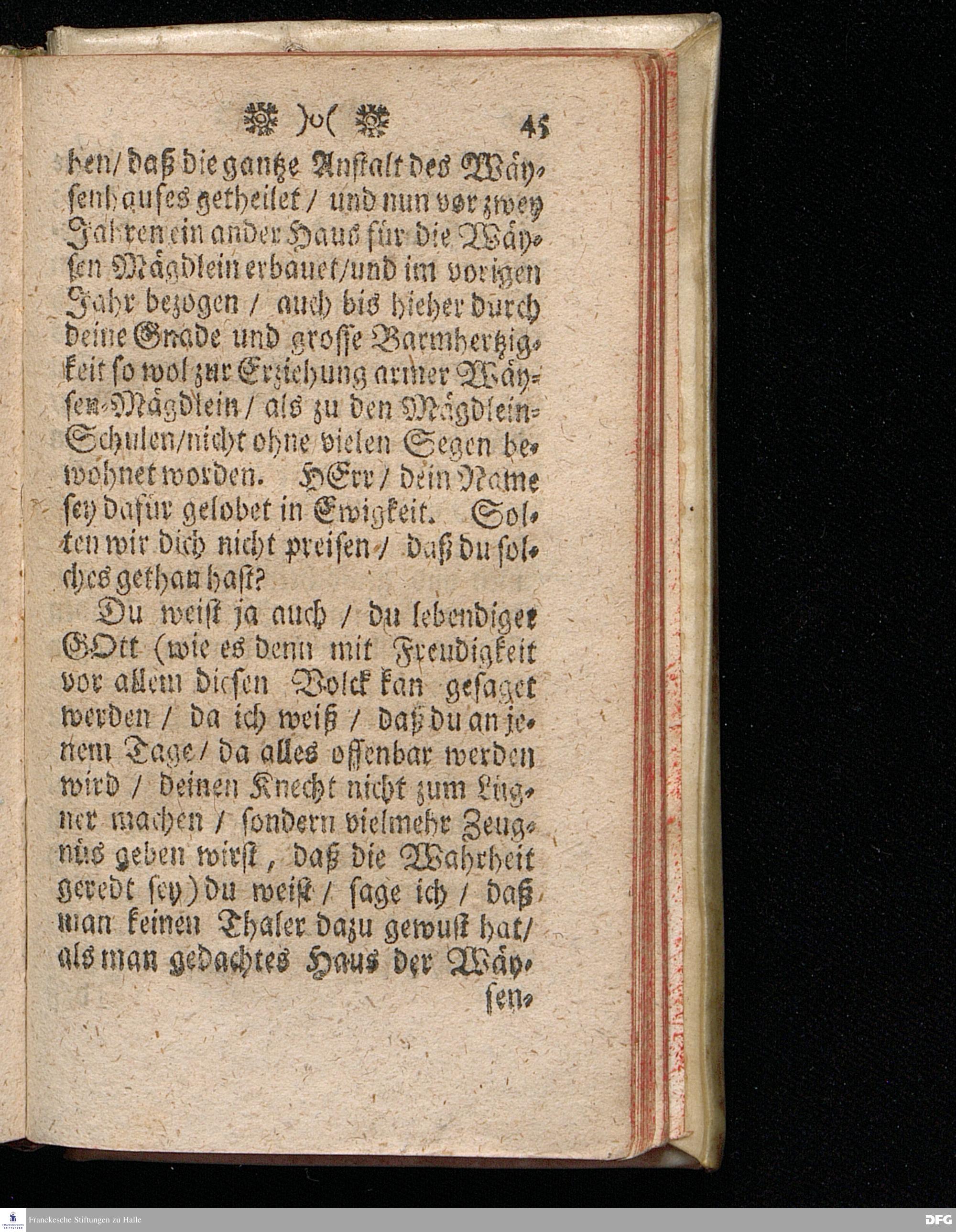 Die Güte GOttes und die Sicherheit unter dem Schatten seiner Flügel / Bey dem ersten öffentlichen Gebrauch eines neu=erbaueten Saals im Waysen=Hause zu Glaucha an Halle / den 5.August. MDCCXI. aus schuldiger Danckbarkeit gegen GOtt und zur Erweckung und Stärckung des Vertrauens auf denselben lebendigen GOTT / vorgestellet Von August Hermann Francken / S.Theol.Prof.Ord.Past.Vlr.u.Sch. Andere Auflage. HALLE, In Verlegung des Wäysenhauses / 1716.