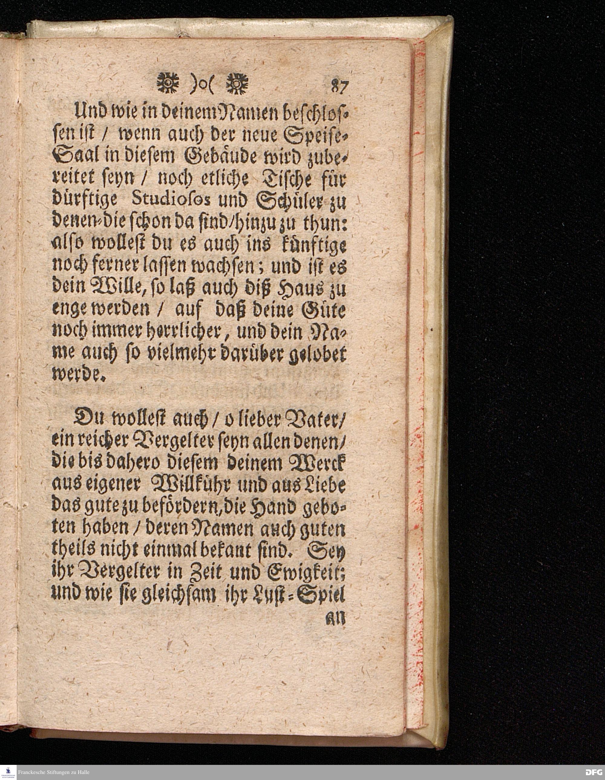 Die Güte GOttes und die Sicherheit unter dem Schatten seiner Flügel / Bey dem ersten öffentlichen Gebrauch eines neu=erbaueten Saals im Waysen=Hause zu Glaucha an Halle / den 5.August. MDCCXI. aus schuldiger Danckbarkeit gegen GOtt und zur Erweckung und Stärckung des Vertrauens auf denselben lebendigen GOTT / vorgestellet Von August Hermann Francken / S.Theol.Prof.Ord.Past.Vlr.u.Sch. Andere Auflage. HALLE, In Verlegung des Wäysenhauses / 1716.