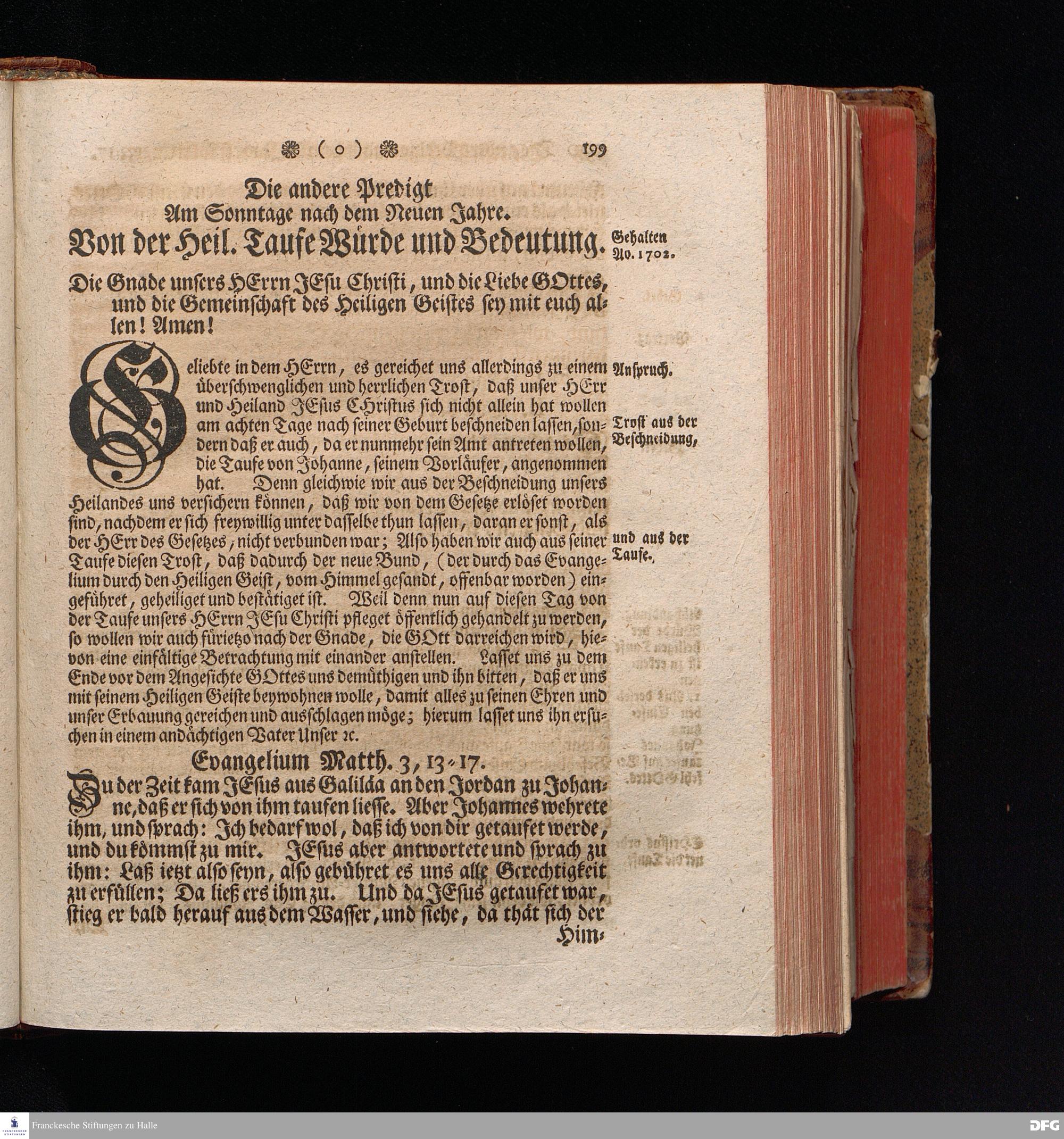 August Hermann Franckens, S.Theol.Prof.und Past. Sonn= Fest= und Apostel=Tags=Predigten, Darinnen Die zum wahren Christenthum gehörige nöthigste und vornehmste Materien abgehandelt sind; Nebst den darzu nützlichen Registern. Die achte EDITION. Mit Königl.Preuß.und Churfl.Brandenb.Privil. HALLE, gedruckt und verlegt im Wäysenhause / MDCCXLVI.