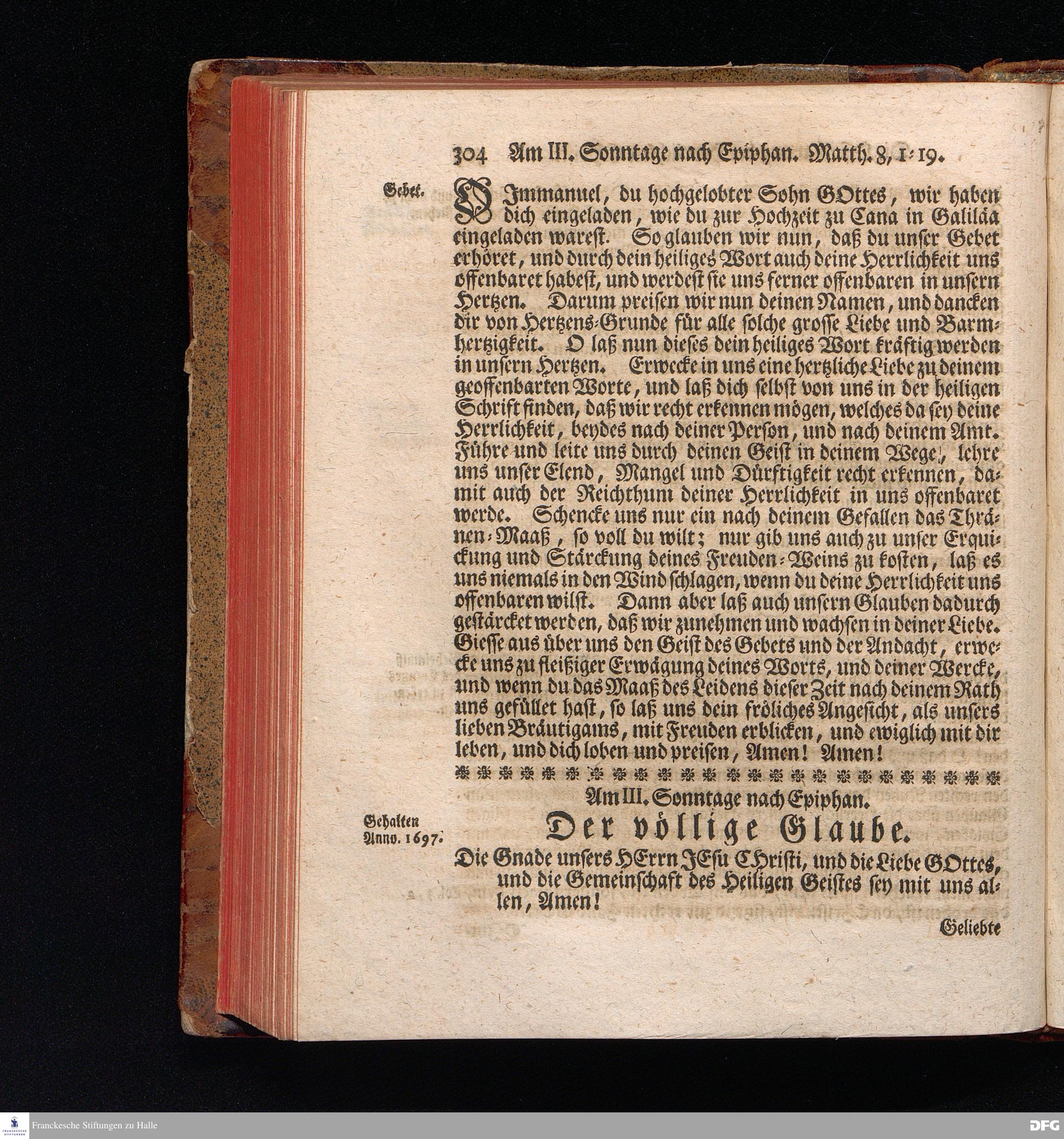 August Hermann Franckens, S.Theol.Prof.und Past. Sonn= Fest= und Apostel=Tags=Predigten, Darinnen Die zum wahren Christenthum gehörige nöthigste und vornehmste Materien abgehandelt sind; Nebst den darzu nützlichen Registern. Die achte EDITION. Mit Königl.Preuß.und Churfl.Brandenb.Privil. HALLE, gedruckt und verlegt im Wäysenhause / MDCCXLVI.