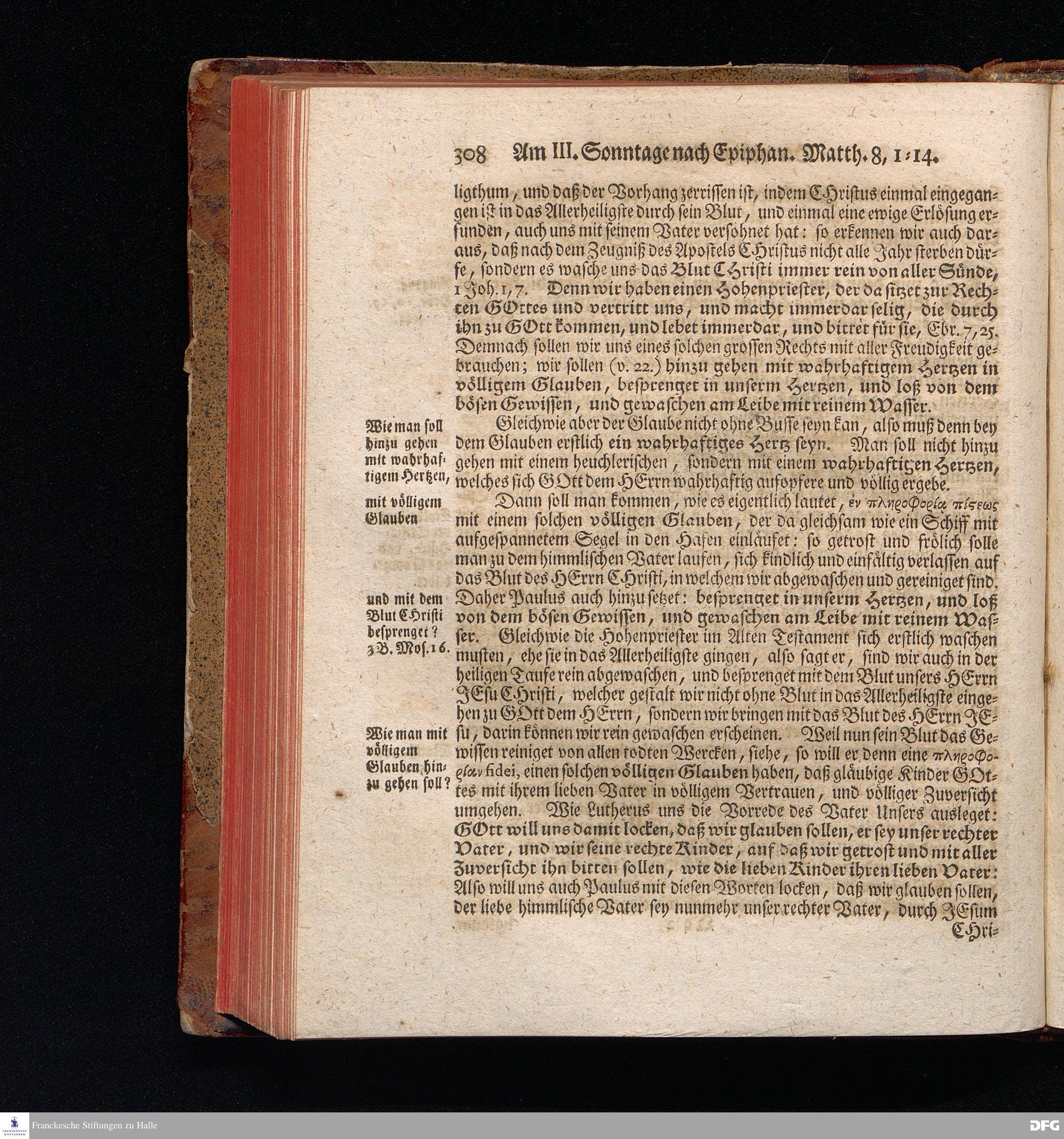 August Hermann Franckens, S.Theol.Prof.und Past. Sonn= Fest= und Apostel=Tags=Predigten, Darinnen Die zum wahren Christenthum gehörige nöthigste und vornehmste Materien abgehandelt sind; Nebst den darzu nützlichen Registern. Die achte EDITION. Mit Königl.Preuß.und Churfl.Brandenb.Privil. HALLE, gedruckt und verlegt im Wäysenhause / MDCCXLVI.