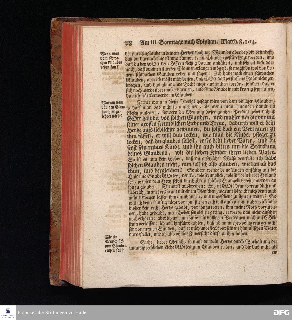 August Hermann Franckens, S.Theol.Prof.und Past. Sonn= Fest= und Apostel=Tags=Predigten, Darinnen Die zum wahren Christenthum gehörige nöthigste und vornehmste Materien abgehandelt sind; Nebst den darzu nützlichen Registern. Die achte EDITION. Mit Königl.Preuß.und Churfl.Brandenb.Privil. HALLE, gedruckt und verlegt im Wäysenhause / MDCCXLVI.