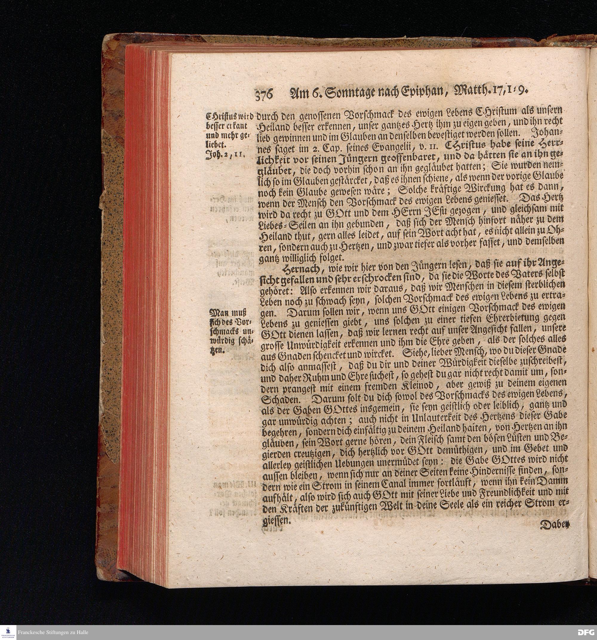 August Hermann Franckens, S.Theol.Prof.und Past. Sonn= Fest= und Apostel=Tags=Predigten, Darinnen Die zum wahren Christenthum gehörige nöthigste und vornehmste Materien abgehandelt sind; Nebst den darzu nützlichen Registern. Die achte EDITION. Mit Königl.Preuß.und Churfl.Brandenb.Privil. HALLE, gedruckt und verlegt im Wäysenhause / MDCCXLVI.