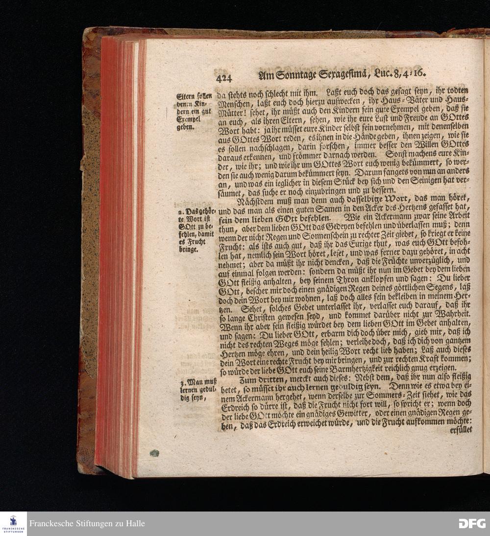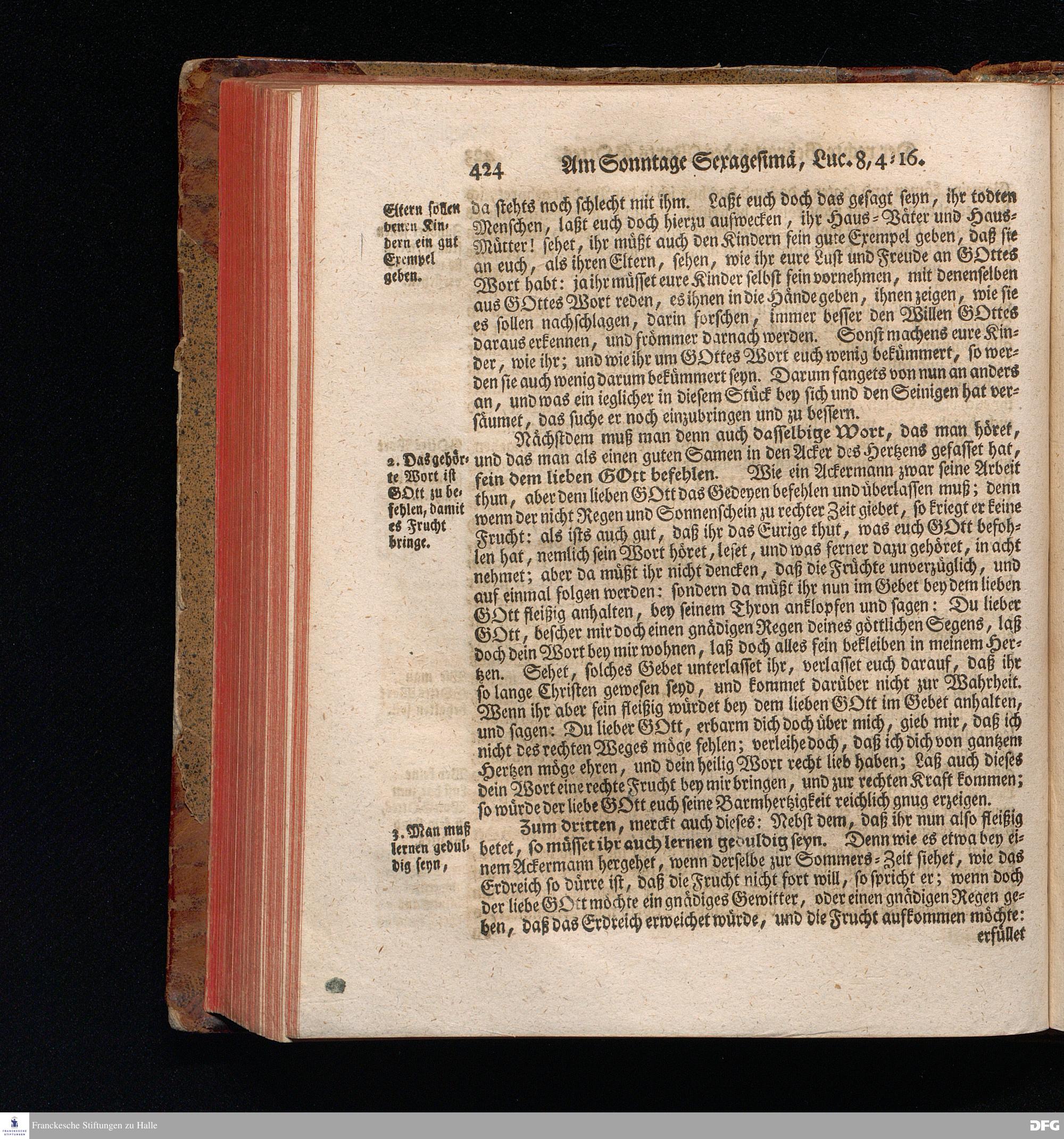 August Hermann Franckens, S.Theol.Prof.und Past. Sonn= Fest= und Apostel=Tags=Predigten, Darinnen Die zum wahren Christenthum gehörige nöthigste und vornehmste Materien abgehandelt sind; Nebst den darzu nützlichen Registern. Die achte EDITION. Mit Königl.Preuß.und Churfl.Brandenb.Privil. HALLE, gedruckt und verlegt im Wäysenhause / MDCCXLVI.
