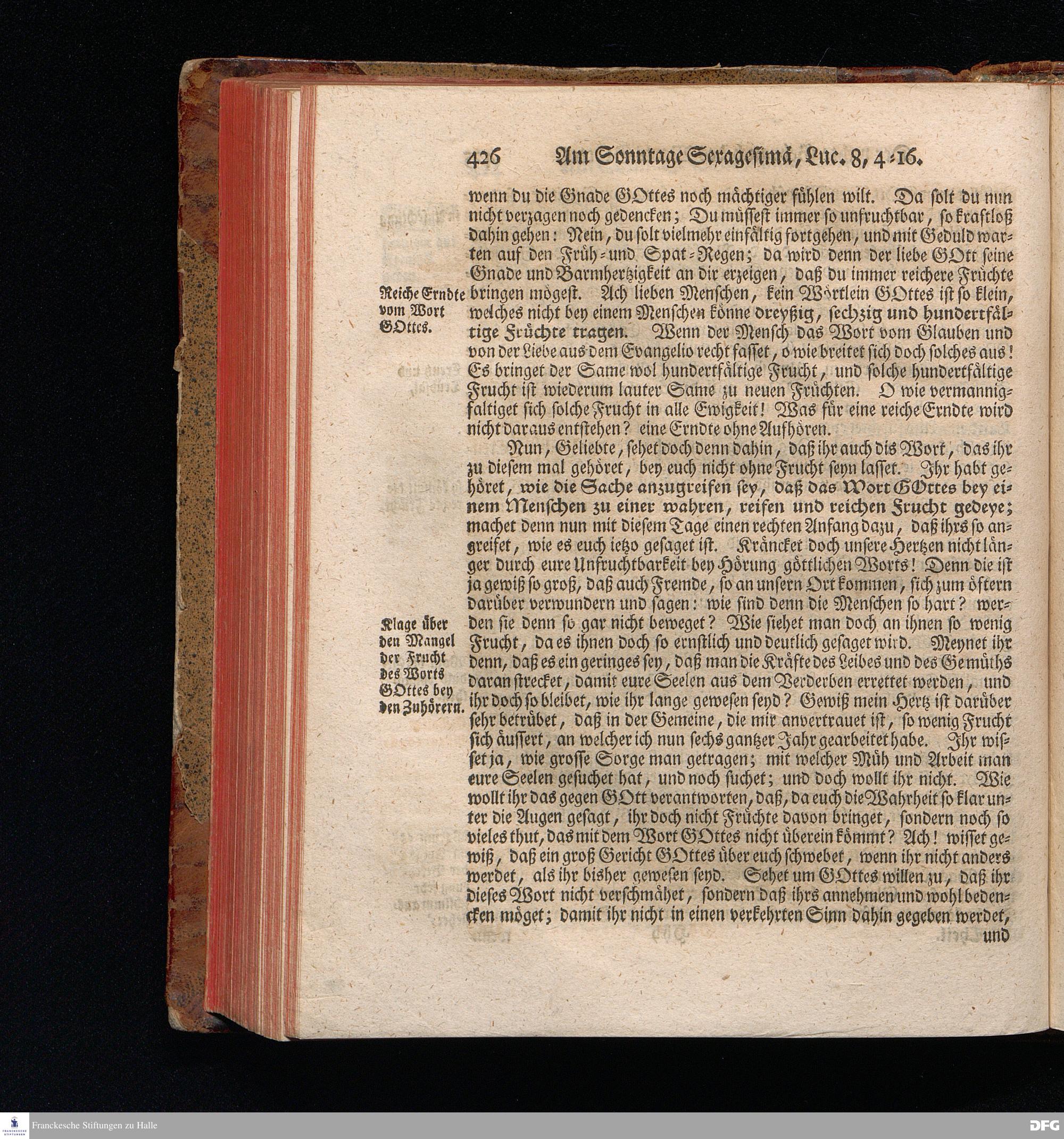 August Hermann Franckens, S.Theol.Prof.und Past. Sonn= Fest= und Apostel=Tags=Predigten, Darinnen Die zum wahren Christenthum gehörige nöthigste und vornehmste Materien abgehandelt sind; Nebst den darzu nützlichen Registern. Die achte EDITION. Mit Königl.Preuß.und Churfl.Brandenb.Privil. HALLE, gedruckt und verlegt im Wäysenhause / MDCCXLVI.