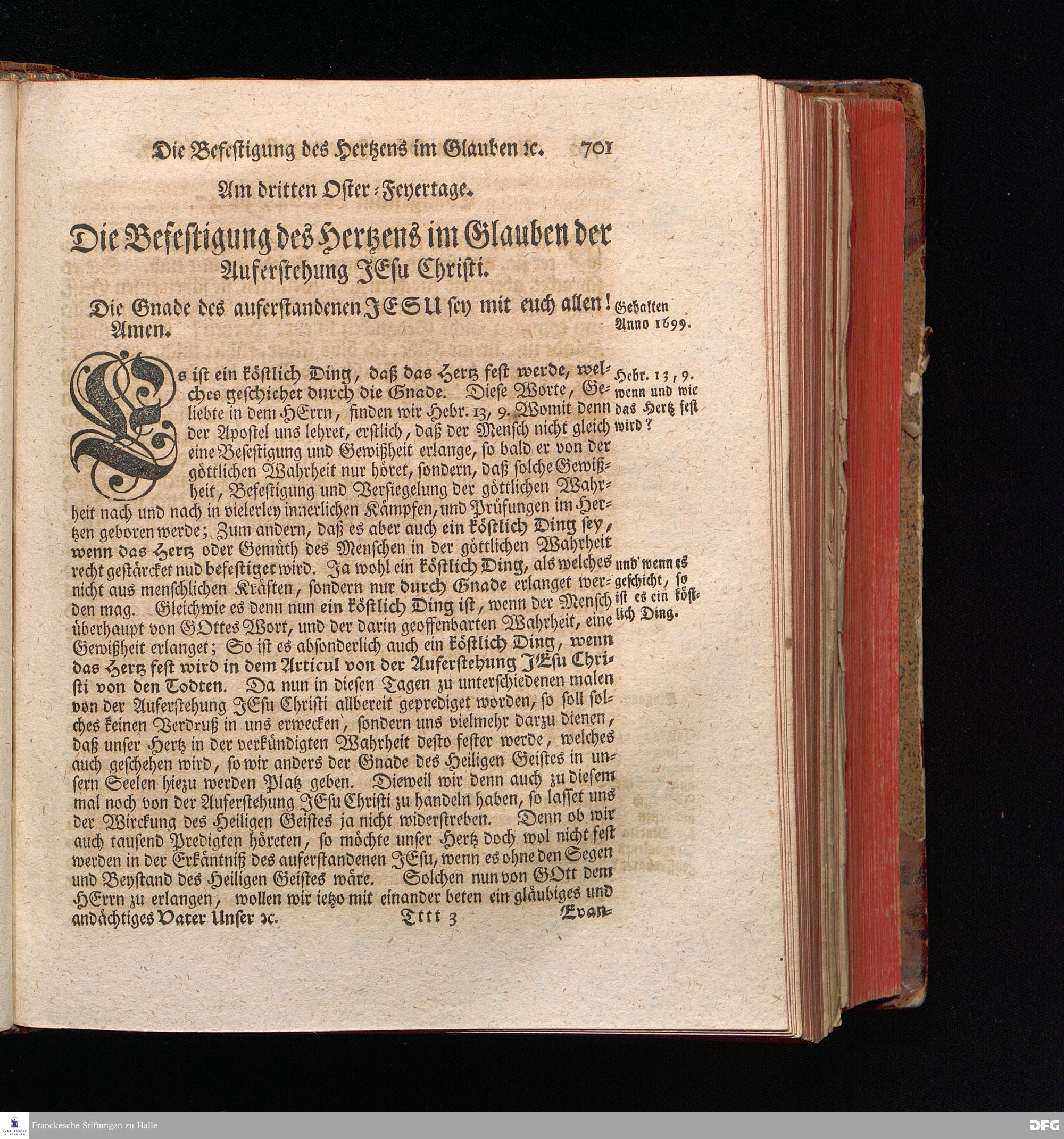 August Hermann Franckens, S.Theol.Prof.und Past. Sonn= Fest= und Apostel=Tags=Predigten, Darinnen Die zum wahren Christenthum gehörige nöthigste und vornehmste Materien abgehandelt sind; Nebst den darzu nützlichen Registern. Die achte EDITION. Mit Königl.Preuß.und Churfl.Brandenb.Privil. HALLE, gedruckt und verlegt im Wäysenhause / MDCCXLVI.