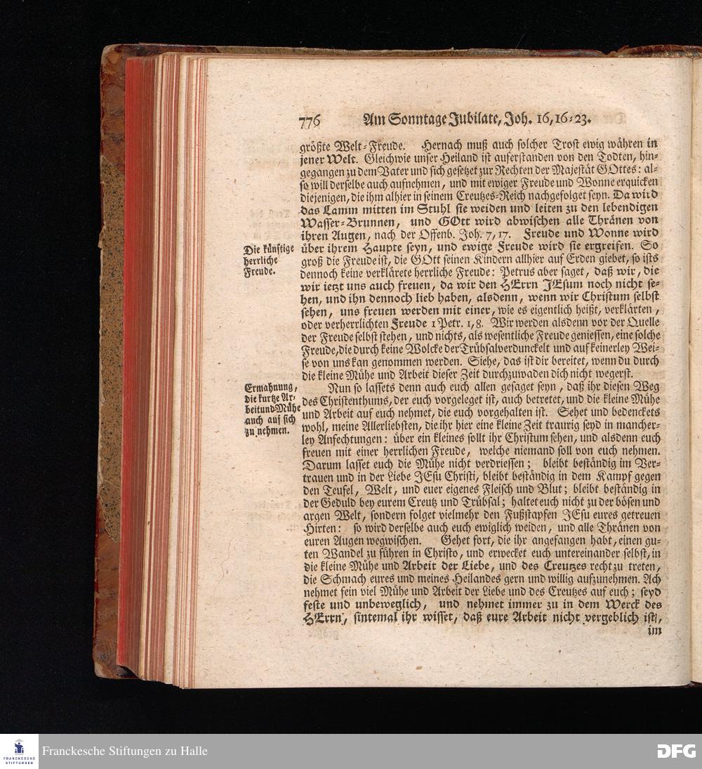 August Hermann Franckens, S.Theol.Prof.und Past. Sonn= Fest= und Apostel=Tags=Predigten, Darinnen Die zum wahren Christenthum gehörige nöthigste und vornehmste Materien abgehandelt sind; Nebst den darzu nützlichen Registern. Die achte EDITION. Mit Königl.Preuß.und Churfl.Brandenb.Privil. HALLE, gedruckt und verlegt im Wäysenhause / MDCCXLVI.