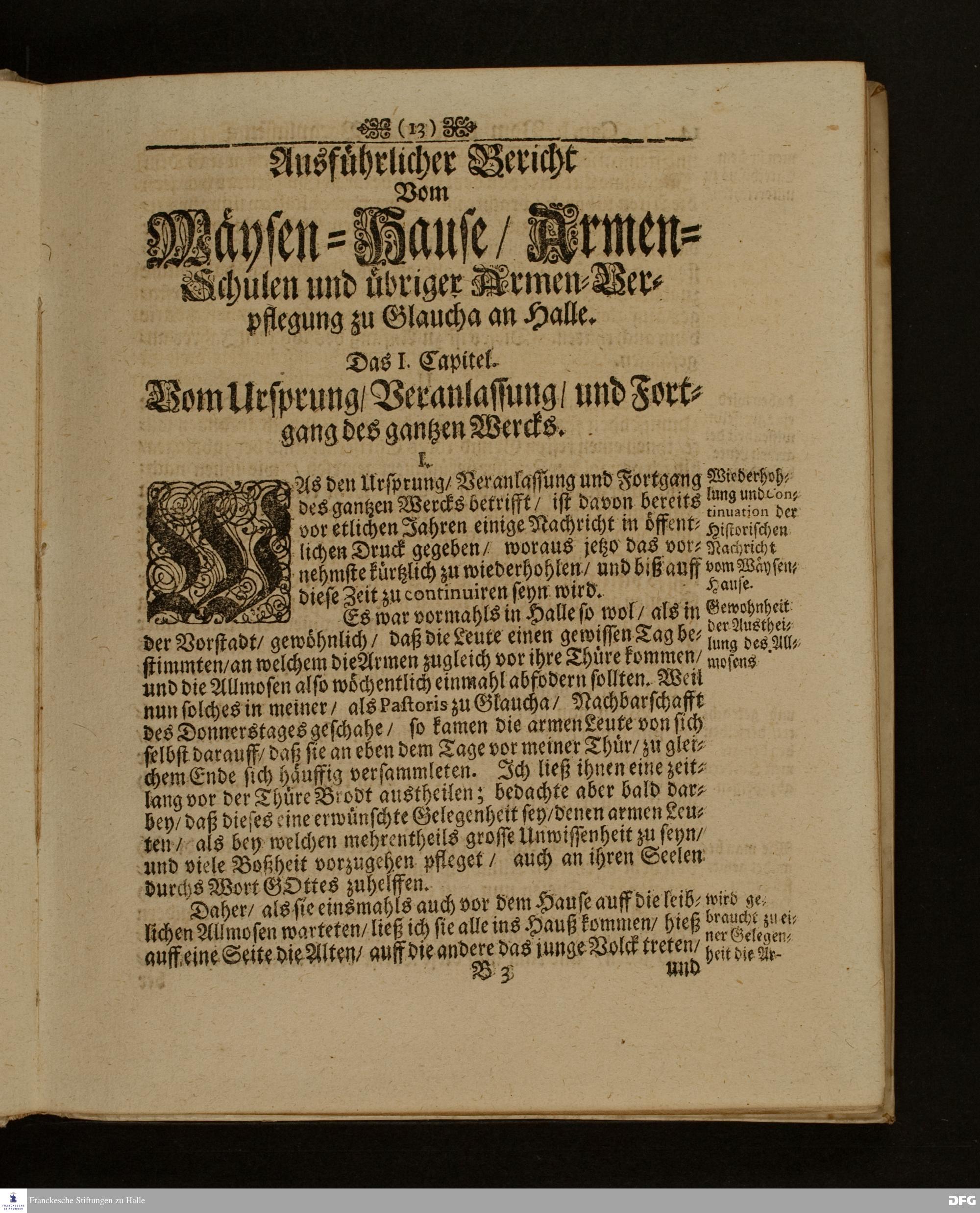 Die Fußstapffen Des noch lebenden und waltenden liebreichen und getreuen GOTTES / Zur Beschämung des Unglaubens / und Stärckung des Glaubens / Durch den Ausführlichen Bericht Vom Wäysen=Hause / Armen=Schulen / und übriger Armen=Verpflegung Zu Glaucha an Halle / Wie selbige fortgesetzet biß Ostern Anno 1701. Entdecket von August Hermann Francken / S.Th.Prof.Ord.und Past. [Spruch.] Mit Königl.Preußischen und Churfl.Brandenb.Privilegio. In Verlegung des Wäysen=Hauses zu Glaucha an Halle / 1701.
