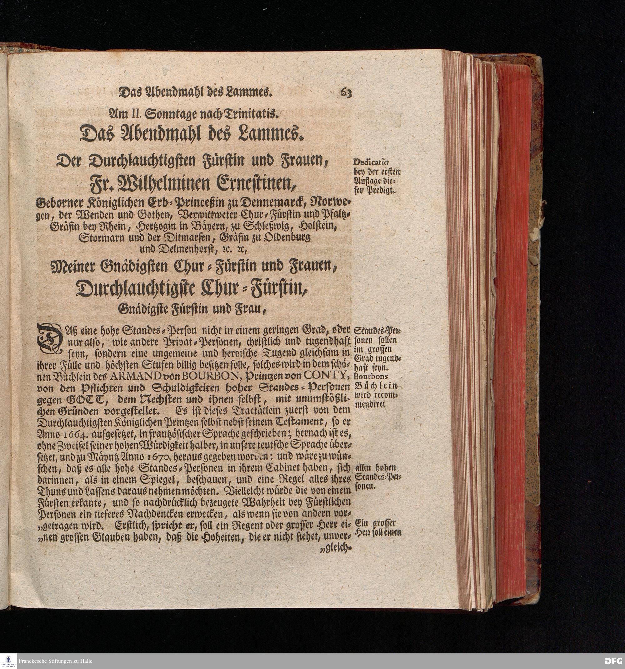 August Hermann Franckens, S.Theol.Prof.und Past. Sonn= Fest= und Apostel=Tags=Predigten, Darinnen Die zum wahren Christenthum gehörige nöthigste und vornehmste Materien abgehandelt sind; Nebst den darzu nützlichen Registern. Die achte EDITION. Mit Königl.Preuß.und Churfl.Brandenb.Privil. HALLE, gedruckt und verlegt im Wäysenhause / MDCCXLVI.