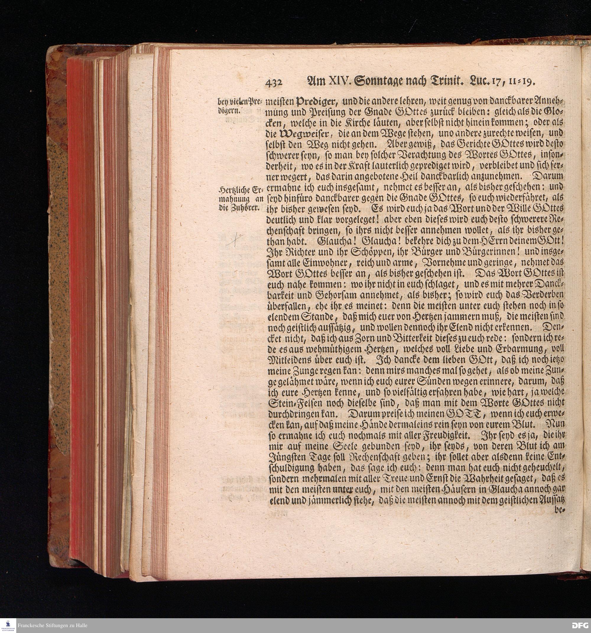 August Hermann Franckens, S.Theol.Prof.und Past. Sonn= Fest= und Apostel=Tags=Predigten, Darinnen Die zum wahren Christenthum gehörige nöthigste und vornehmste Materien abgehandelt sind; Nebst den darzu nützlichen Registern. Die achte EDITION. Mit Königl.Preuß.und Churfl.Brandenb.Privil. HALLE, gedruckt und verlegt im Wäysenhause / MDCCXLVI.