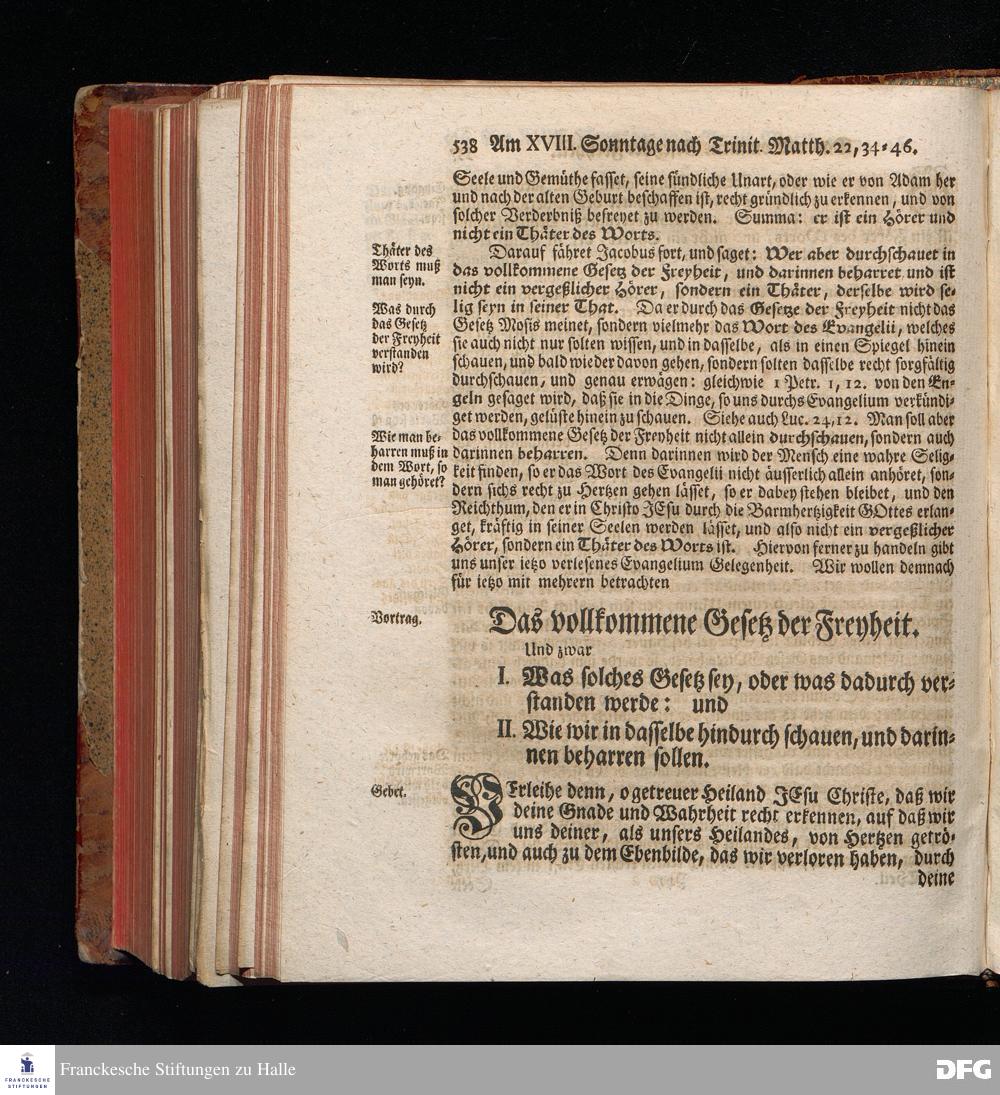 August Hermann Franckens, S.Theol.Prof.und Past. Sonn= Fest= und Apostel=Tags=Predigten, Darinnen Die zum wahren Christenthum gehörige nöthigste und vornehmste Materien abgehandelt sind; Nebst den darzu nützlichen Registern. Die achte EDITION. Mit Königl.Preuß.und Churfl.Brandenb.Privil. HALLE, gedruckt und verlegt im Wäysenhause / MDCCXLVI.