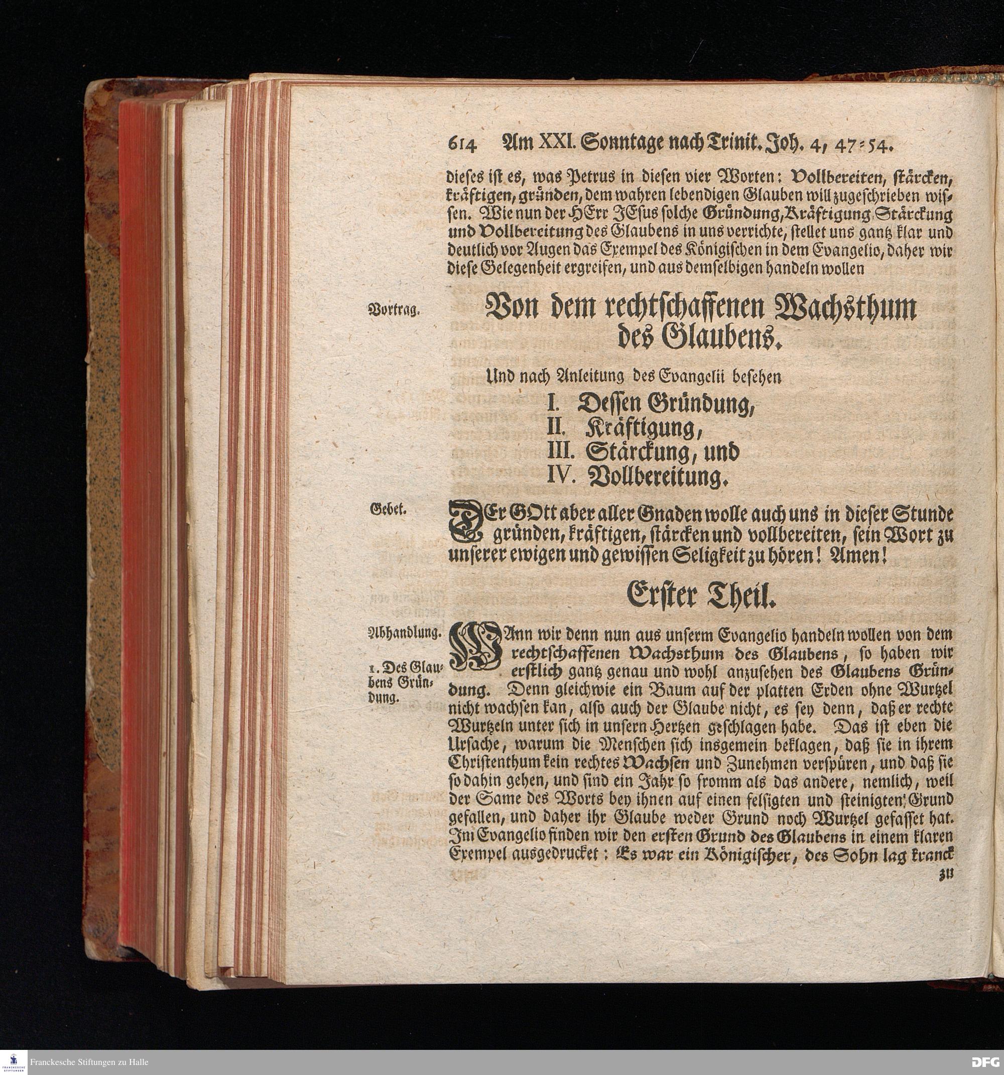 August Hermann Franckens, S.Theol.Prof.und Past. Sonn= Fest= und Apostel=Tags=Predigten, Darinnen Die zum wahren Christenthum gehörige nöthigste und vornehmste Materien abgehandelt sind; Nebst den darzu nützlichen Registern. Die achte EDITION. Mit Königl.Preuß.und Churfl.Brandenb.Privil. HALLE, gedruckt und verlegt im Wäysenhause / MDCCXLVI.