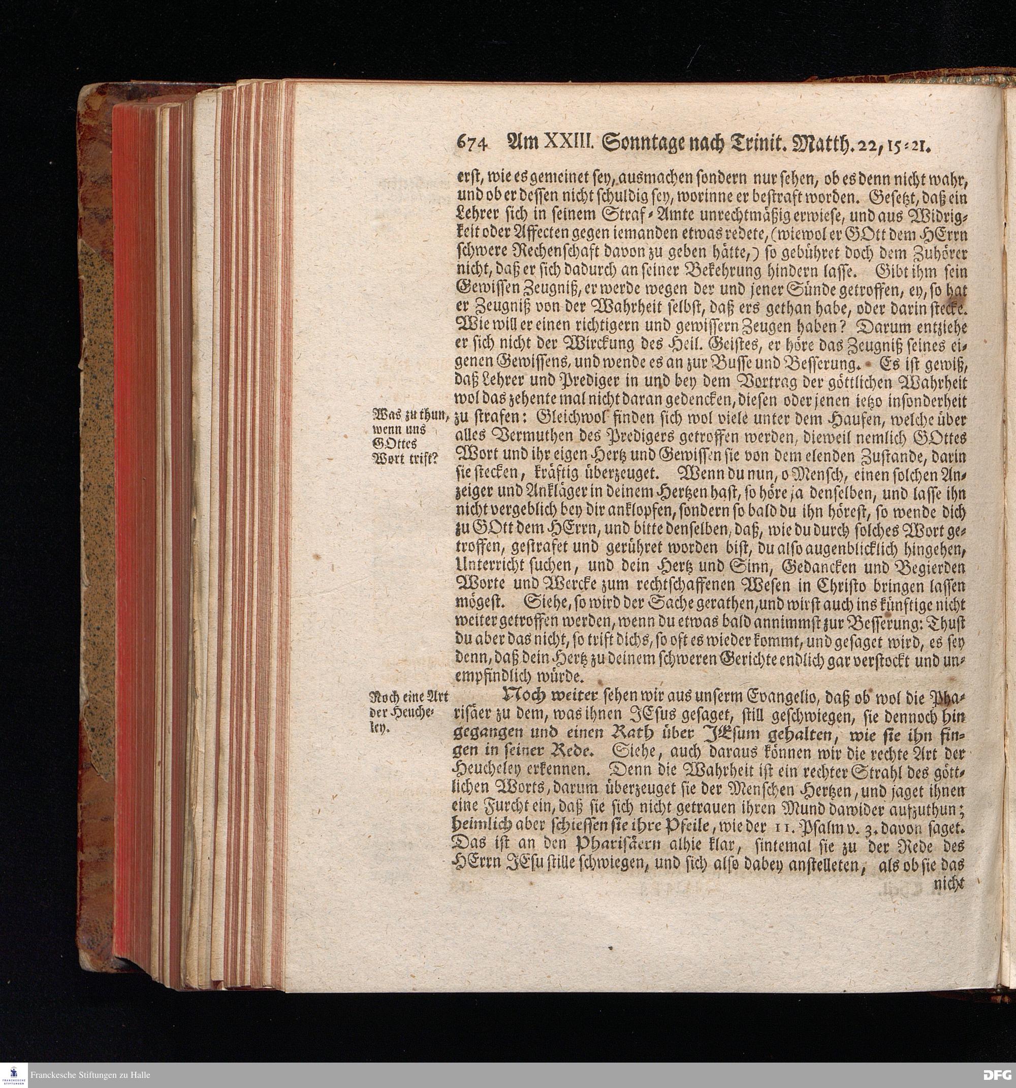 August Hermann Franckens, S.Theol.Prof.und Past. Sonn= Fest= und Apostel=Tags=Predigten, Darinnen Die zum wahren Christenthum gehörige nöthigste und vornehmste Materien abgehandelt sind; Nebst den darzu nützlichen Registern. Die achte EDITION. Mit Königl.Preuß.und Churfl.Brandenb.Privil. HALLE, gedruckt und verlegt im Wäysenhause / MDCCXLVI.