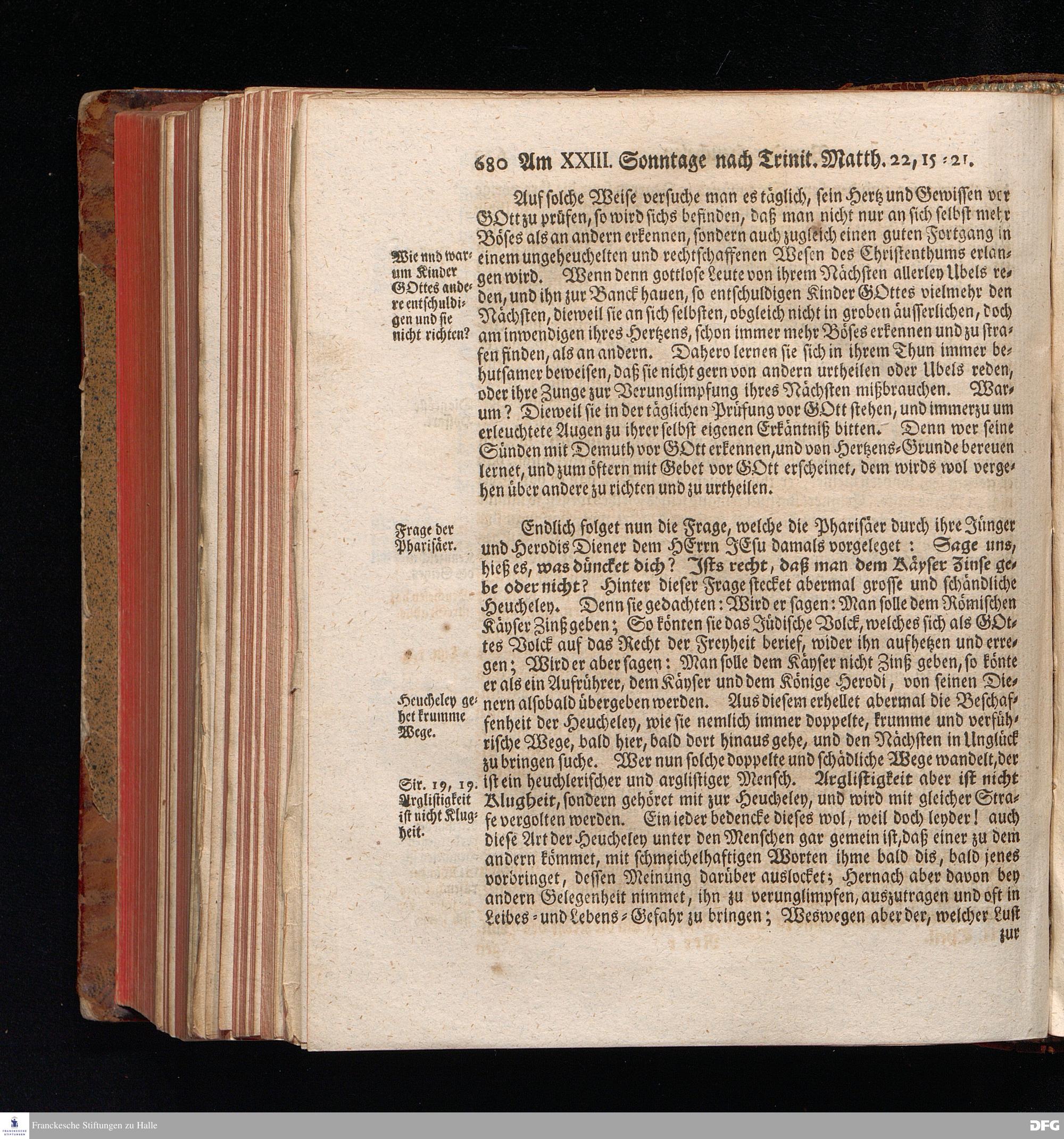 August Hermann Franckens, S.Theol.Prof.und Past. Sonn= Fest= und Apostel=Tags=Predigten, Darinnen Die zum wahren Christenthum gehörige nöthigste und vornehmste Materien abgehandelt sind; Nebst den darzu nützlichen Registern. Die achte EDITION. Mit Königl.Preuß.und Churfl.Brandenb.Privil. HALLE, gedruckt und verlegt im Wäysenhause / MDCCXLVI.