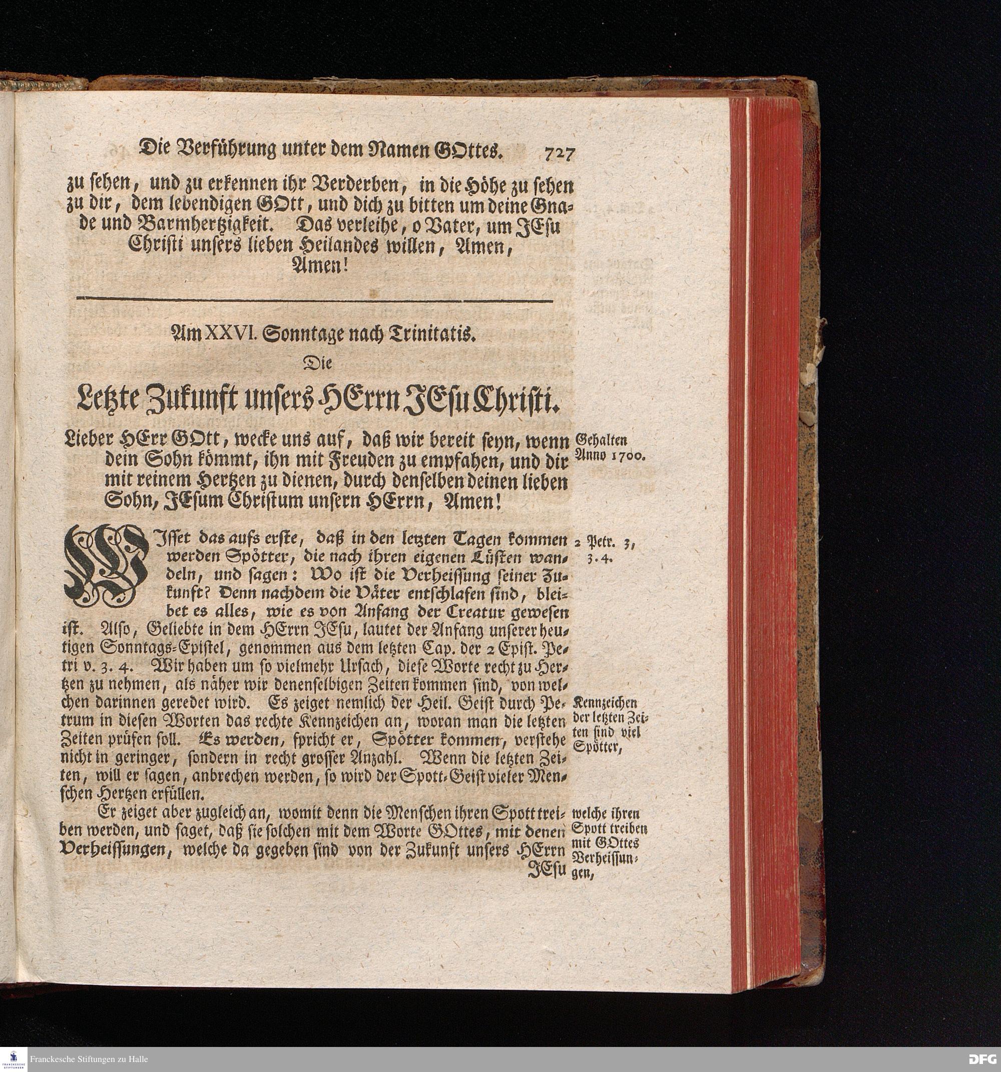 August Hermann Franckens, S.Theol.Prof.und Past. Sonn= Fest= und Apostel=Tags=Predigten, Darinnen Die zum wahren Christenthum gehörige nöthigste und vornehmste Materien abgehandelt sind; Nebst den darzu nützlichen Registern. Die achte EDITION. Mit Königl.Preuß.und Churfl.Brandenb.Privil. HALLE, gedruckt und verlegt im Wäysenhause / MDCCXLVI.