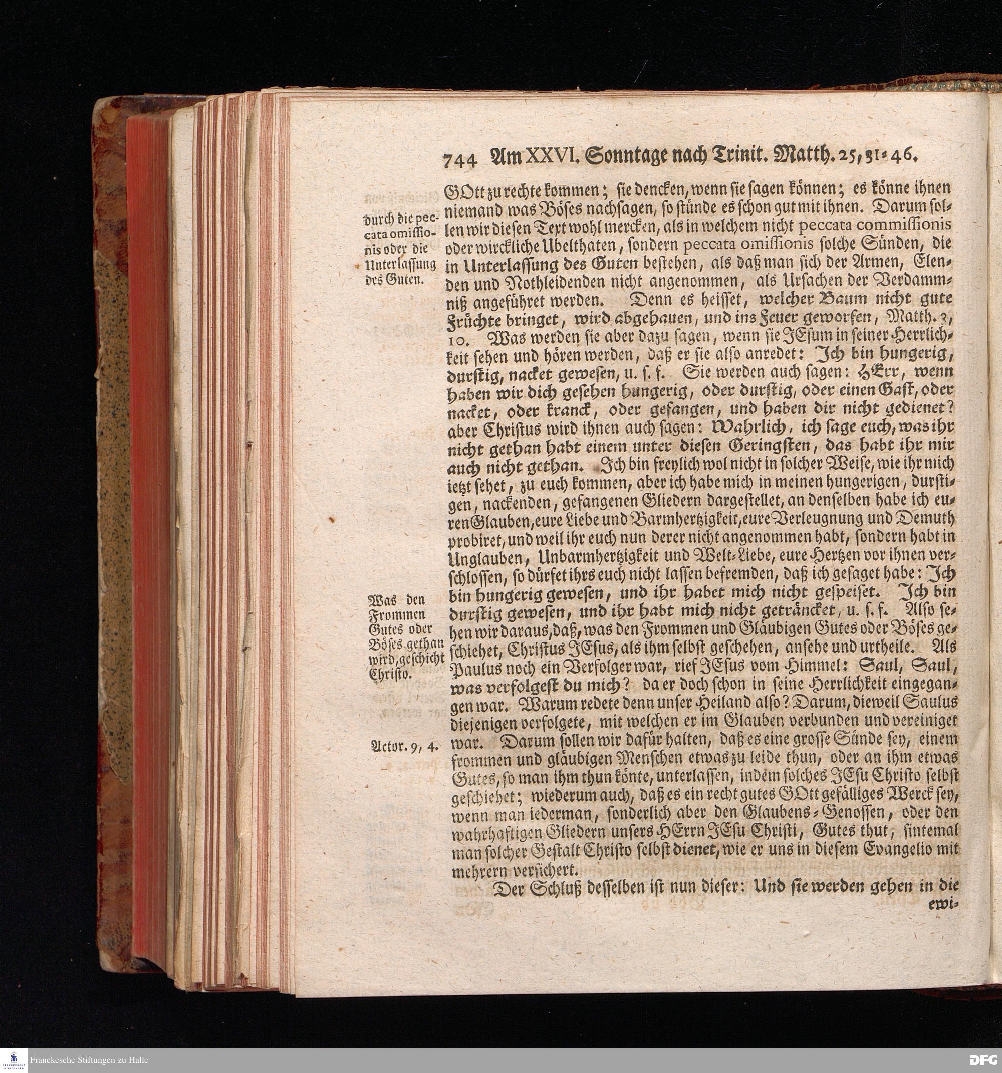 August Hermann Franckens, S.Theol.Prof.und Past. Sonn= Fest= und Apostel=Tags=Predigten, Darinnen Die zum wahren Christenthum gehörige nöthigste und vornehmste Materien abgehandelt sind; Nebst den darzu nützlichen Registern. Die achte EDITION. Mit Königl.Preuß.und Churfl.Brandenb.Privil. HALLE, gedruckt und verlegt im Wäysenhause / MDCCXLVI.