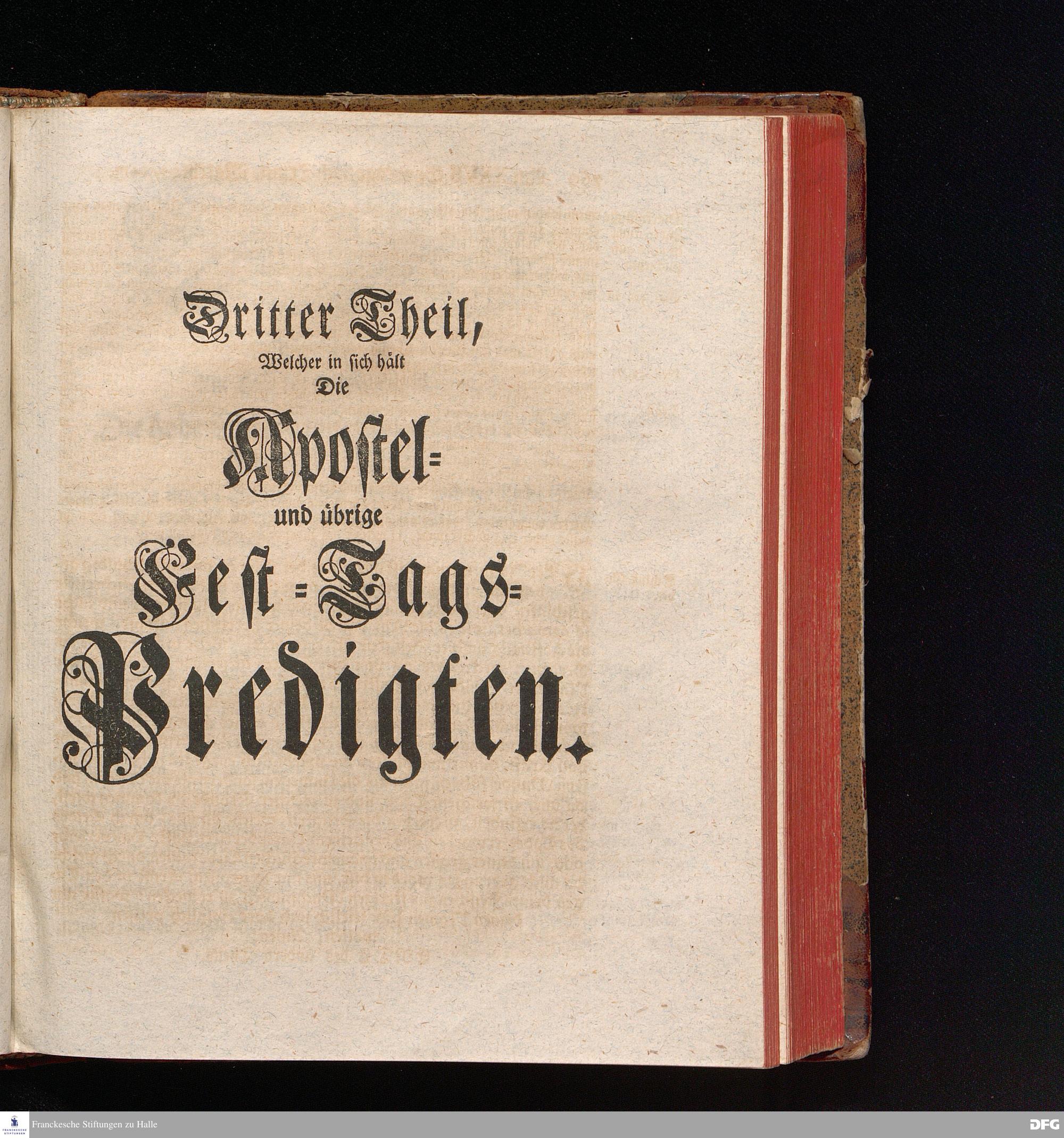 August Hermann Franckens, S.Theol.Prof.und Past. Sonn= Fest= und Apostel=Tags=Predigten, Darinnen Die zum wahren Christenthum gehörige nöthigste und vornehmste Materien abgehandelt sind; Nebst den darzu nützlichen Registern. Die achte EDITION. Mit Königl.Preuß.und Churfl.Brandenb.Privil. HALLE, gedruckt und verlegt im Wäysenhause / MDCCXLVI.