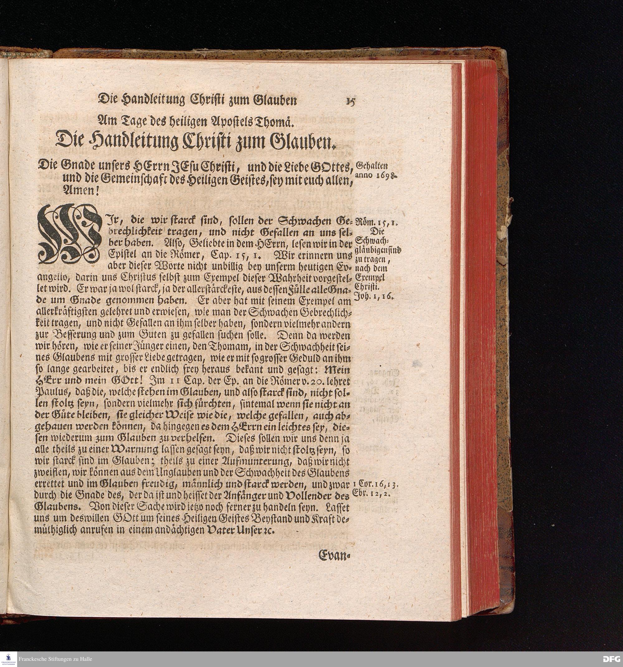 August Hermann Franckens, S.Theol.Prof.und Past. Sonn= Fest= und Apostel=Tags=Predigten, Darinnen Die zum wahren Christenthum gehörige nöthigste und vornehmste Materien abgehandelt sind; Nebst den darzu nützlichen Registern. Die achte EDITION. Mit Königl.Preuß.und Churfl.Brandenb.Privil. HALLE, gedruckt und verlegt im Wäysenhause / MDCCXLVI.