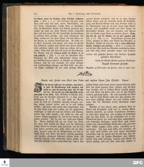 August Hermann Francke's weil.d.Theol.Prof.u.Pastor in Halle a.S., Sonn-, Fest- u. Aposteltags-Predigten, darinnen die zum wahren Christenthum gehörigen und vornehmsten Lehren behandelt sind. Aufs neue herausgegeben, verlegt und nur allein zu beziehen vom Ostpr.evang.Gebets=Verein in Berlin, Anklamstraße 31. Tilsit 1902. Gedruckt bei M. Jagomast.