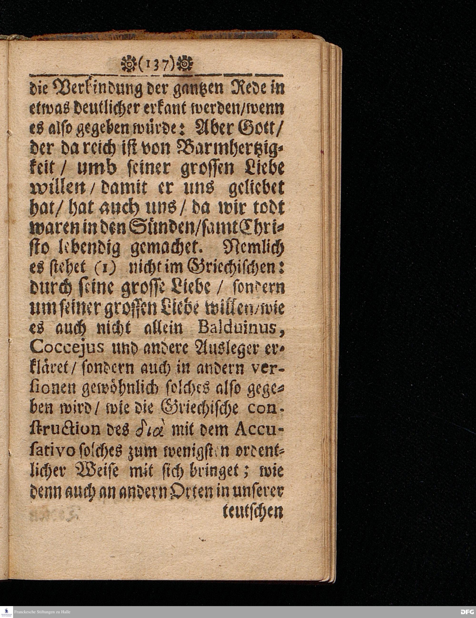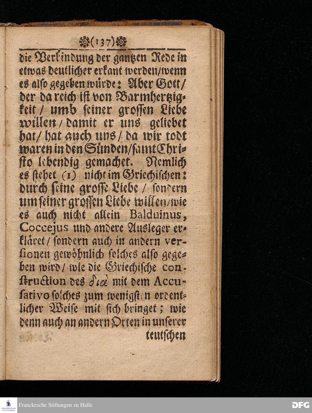 M.Aug.Hermann Franckens Gr.& Or.Lingg.Pr.Ord.& Past.Glauch. OBSERVATIONES BIBLICÆ, oder Anmerckungen über einige Oerter H. Schrifft / Darinnen die Teutsche Ubersetzung des Sel.Lutheri gegen den Original-Text gehalten und bescheidentlich gezeiget wird / Wo man dem eigentlichen Wort=Verstande näher ko\-men könne / Solches auch Zur Erbauung in der Christl.Lehre angewendet / und im Gebet appliciret wird / ausgefertiget im FEBRUARIO 1695. Halle / Gedruckt bey Christoph Salfelden.