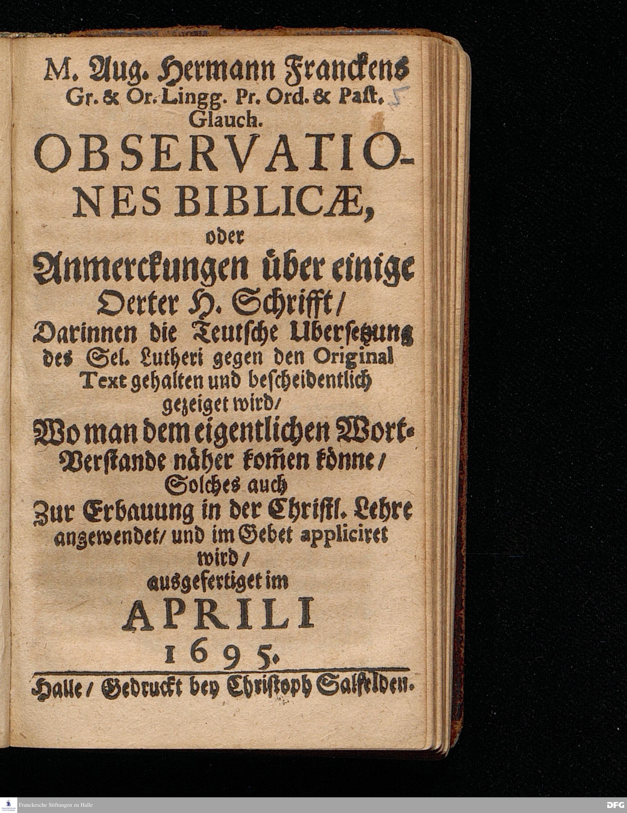 M.Aug.Hermann Franckens Gr.& Or.Lingg.Pr.Ord.& Past.Glauch. OBSERVATIONES BIBLICÆ, oder Anmerckungen über einige Oerter H. Schrifft / Darinnen die Teutsche Ubersetzung des Sel.Lutheri gegen den Original Text gehalten und bescheidentlich gezeiget wird / Wo man dem eigentlichen Wort=Verstande näher ko\-men könne / Solches auch Zur Erbauung in der Christl.Lehre angewendet / und im Gebet appliciret wird / ausgefertiget im APRILI 1695. Halle / Gedruckt bey Christoph Salfelden.