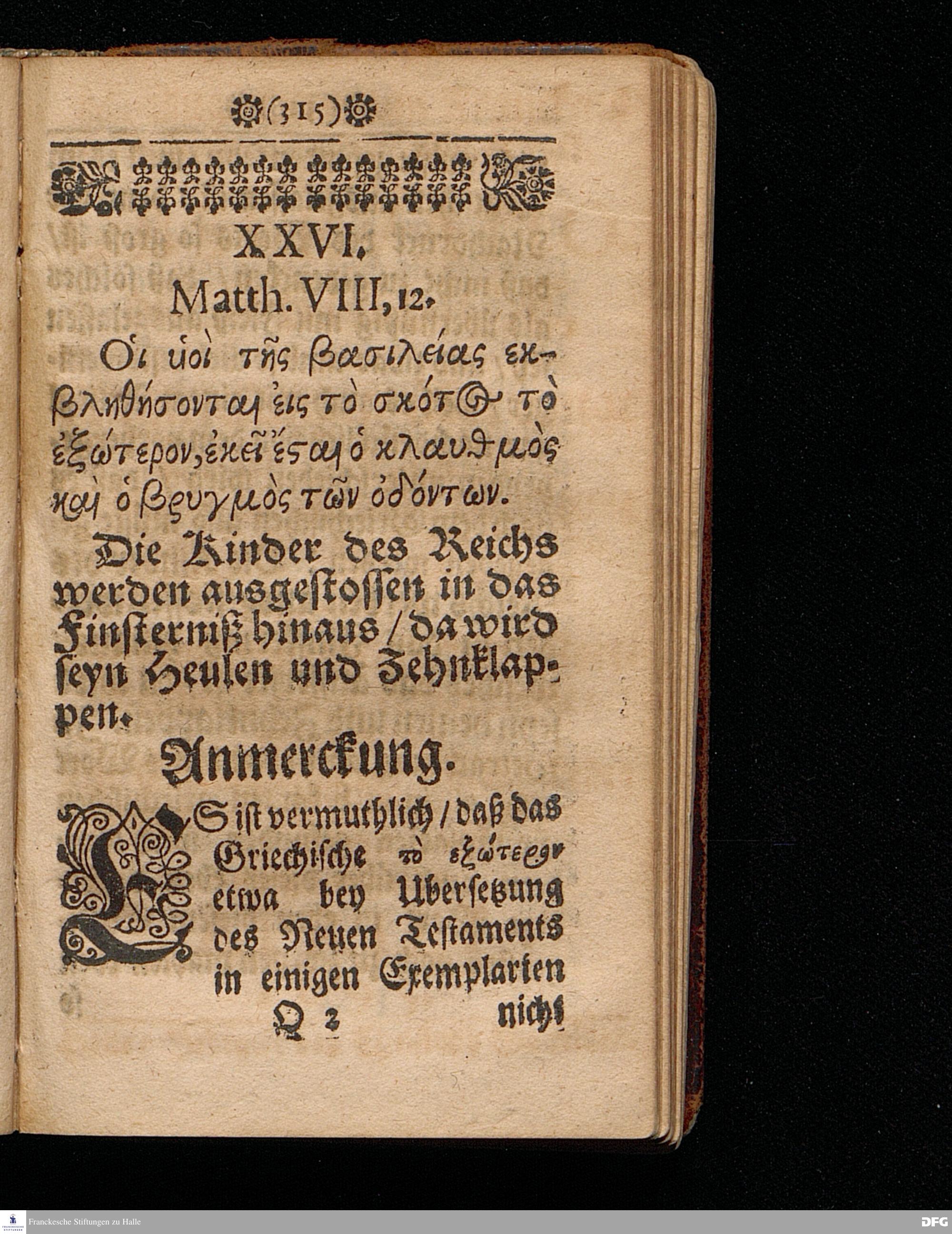 M.Aug.Hermann Franckens Gr.& Or.Lingg.Pr.Ord.& Past.Glauch. OBSERVATIONES BIBLICÆ, oder Anmerckungen über einige Oerter H. Schrifft / Darinnen die Teutsche Ubersetzung des Sel.Lutheri gegen den Original Text gehalten und bescheidentlich gezeiget wird / Wo man dem eigentlichen Wort=Verstande näher ko\-men könne / Solches auch Zur Erbauung in der Christl.Lehre angewendet / und im Gebet appliciret wird / ausgefertiget im APRILI 1695. Halle / Gedruckt bey Christoph Salfelden.