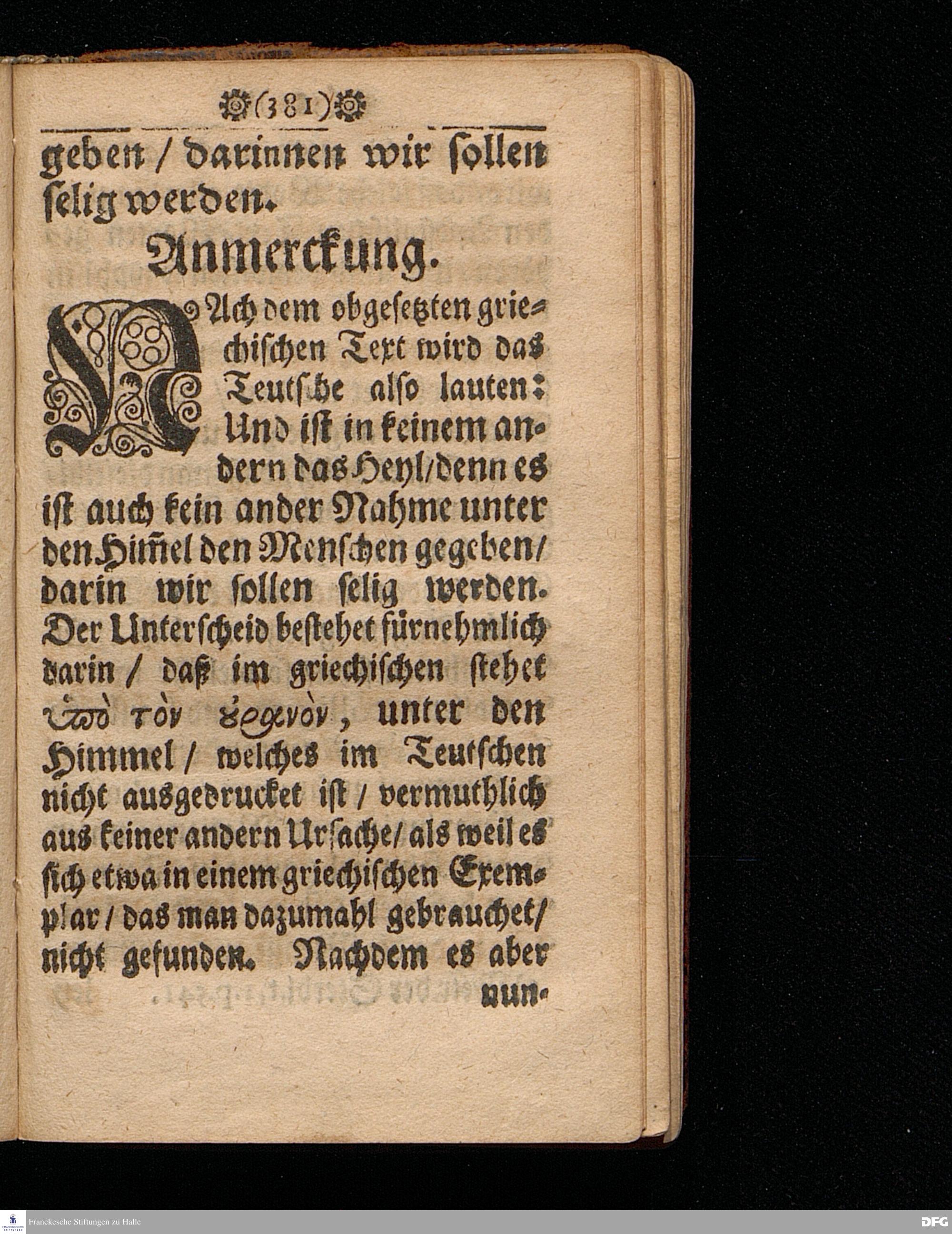 M.Aug.Hermann Franckens Gr.& Or.Lingg.Pr.Ord.& Past.Glauch. OBSERVATIONES BIBLICÆ, oder Anmerckungen über einige Oerter H. Schrifft / Darinnen die Teutsche Ubersetzung des Sel.Lutheri gegen den Original Text gehalten und bescheidentlich gezeiget wird / Wo man dem eigentlichen Wort=Verstande näher ko\-men könne / Solches auch Zur Erbauung in der Christl.Lehre angewendet / und im Gebet appliciret wird / ausgefertiget im APRILI 1695. Halle / Gedruckt bey Christoph Salfelden.