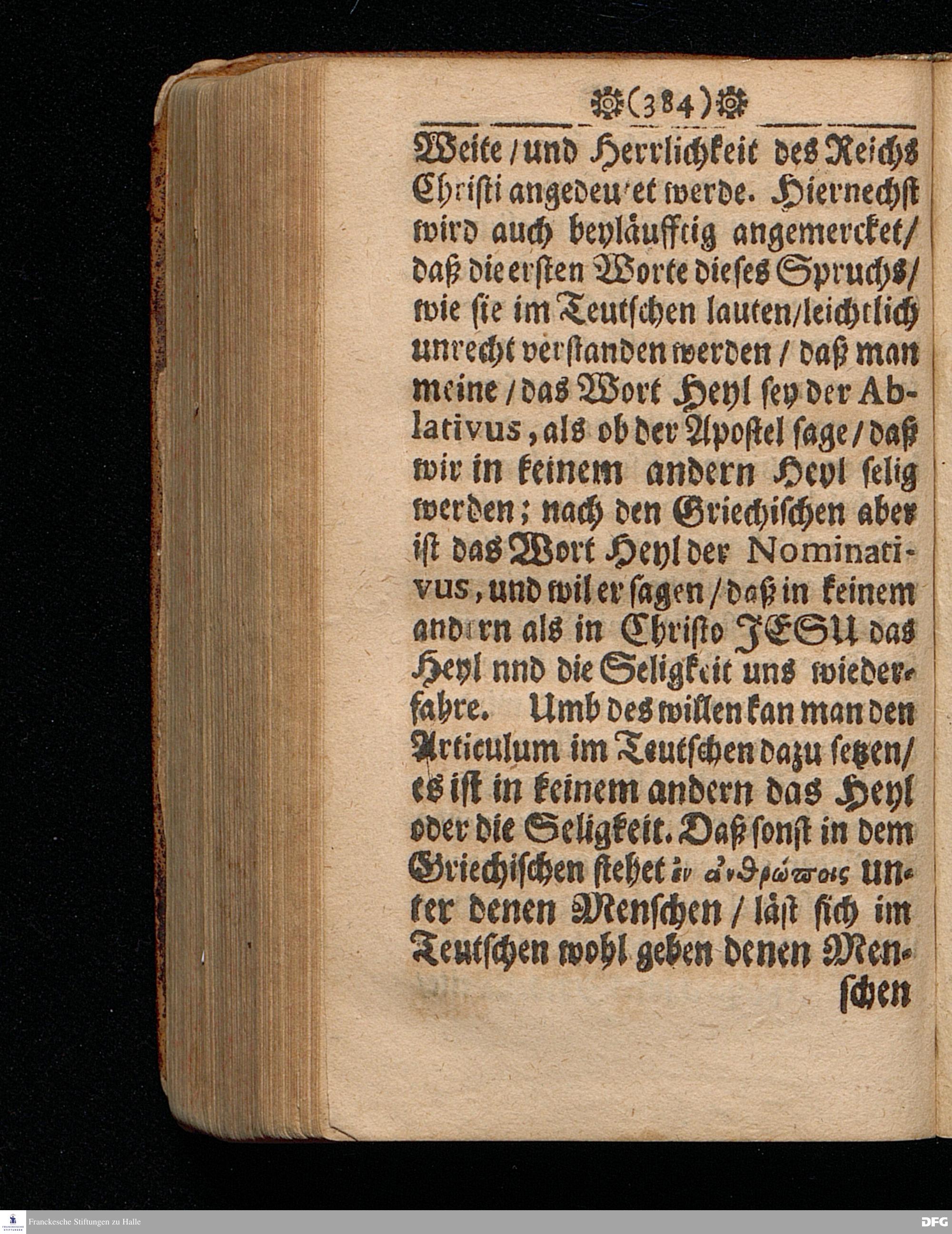 M.Aug.Hermann Franckens Gr.& Or.Lingg.Pr.Ord.& Past.Glauch. OBSERVATIONES BIBLICÆ, oder Anmerckungen über einige Oerter H. Schrifft / Darinnen die Teutsche Ubersetzung des Sel.Lutheri gegen den Original Text gehalten und bescheidentlich gezeiget wird / Wo man dem eigentlichen Wort=Verstande näher ko\-men könne / Solches auch Zur Erbauung in der Christl.Lehre angewendet / und im Gebet appliciret wird / ausgefertiget im APRILI 1695. Halle / Gedruckt bey Christoph Salfelden.