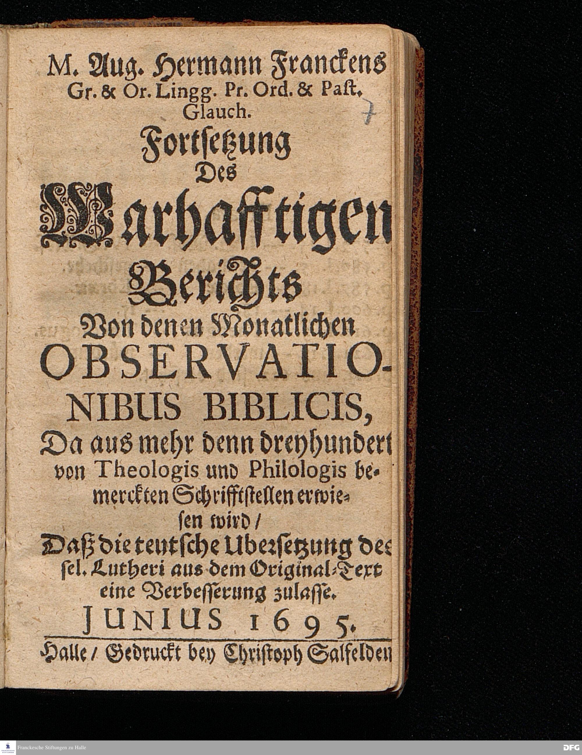 M.Aug.Hermann Franckens Gr.& Or.Lingg.Pr.Ord.& Past.Glauch. Fortsetzung Des Warhafftigen Berichts Von denen Monatlichen OBSERVATIONIBUS BIBLICIS, Da aus mehr denn dreyhundert von Theologis und Philologis bemerckten Schrifftstellen erwiesen wird / Daß die teutsche Ubersetzung des sel.Lutheri aus dem Original=Text eine Verbesserung zulasse. JUNIUS 1695. Halle / Gedruckt bey Christoph Salfelden.